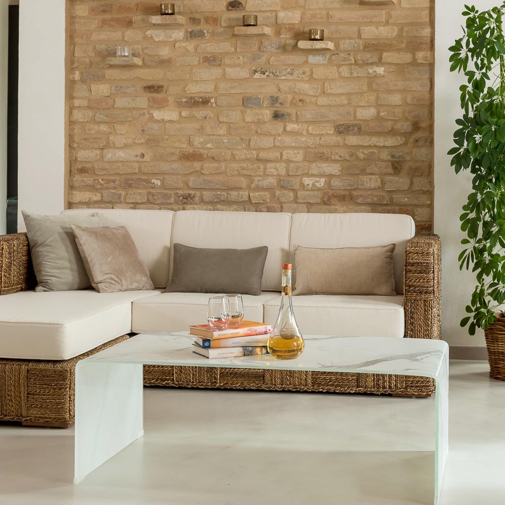 Detta eleganta, moderna soffbord är tillverkat av 10 mm härdat, böjt glas med en raffinerad marmorfinish , vilket ger rummet ett ljust och sofistikerat utseende. Dess enkla form och monolitiska struktur framhäver de rena linjerna.