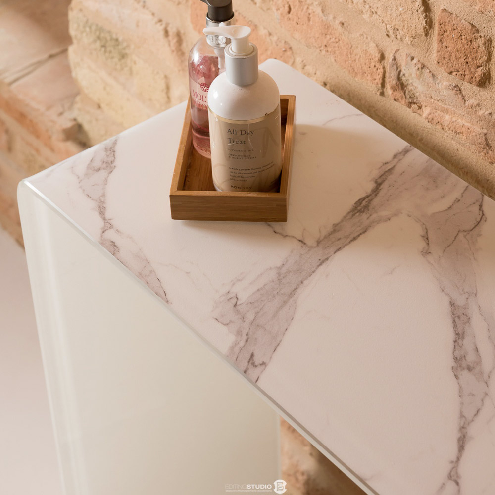 Detta eleganta, moderna konsolbord är tillverkat av 10 mm böjt härdat glas med en raffinerad marmorfinish , vilket ger utrymmet en touch av sofistikering och ljusstyrka. Den monolitiska strukturen förstärker produktens minimalistiska estetik.