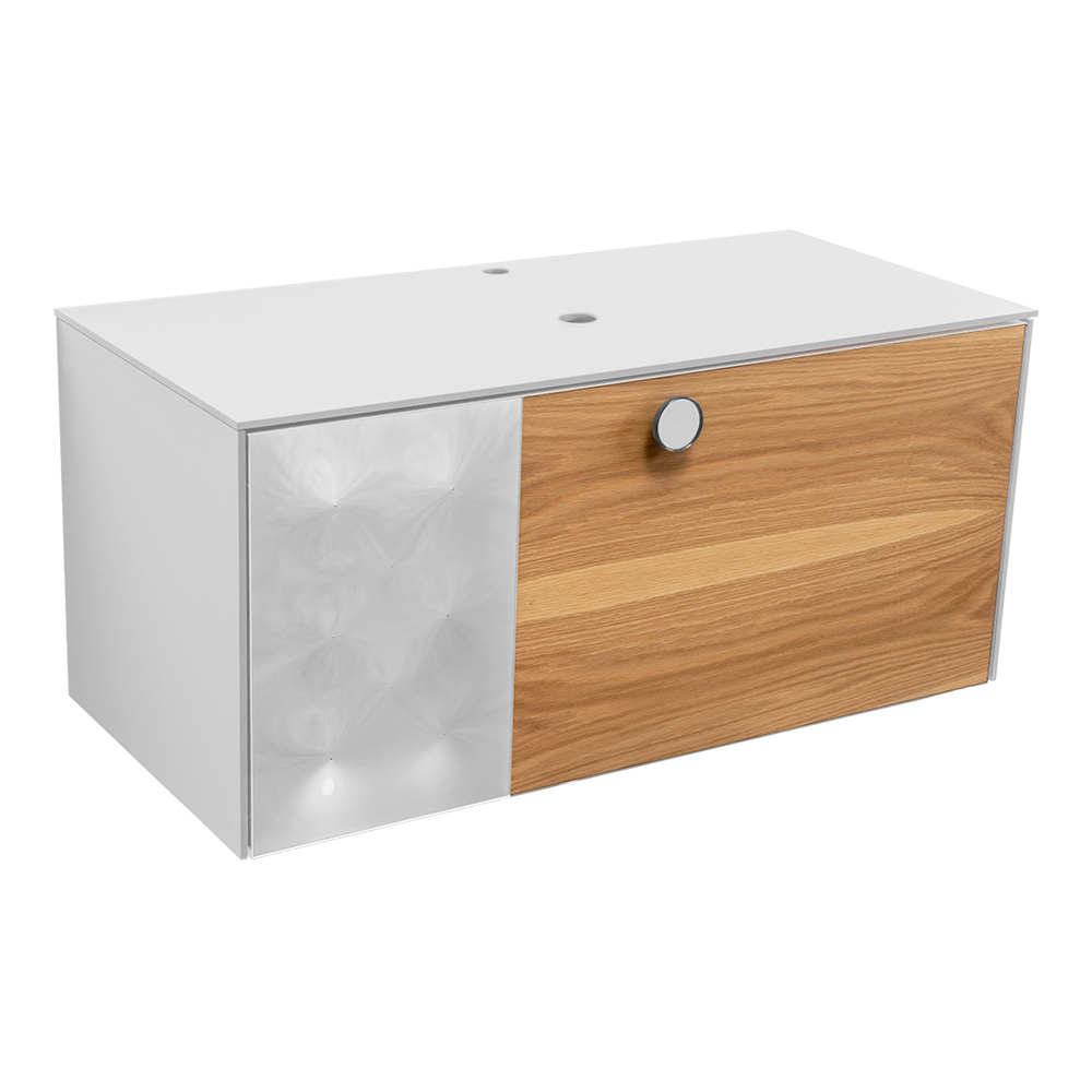 Den upphängda modulen har en invändig låda : den första med en reserv för avloppet, utrustad med avdelare och en frontpanel i ek och den andra med ett stort förvaringsutrymme.