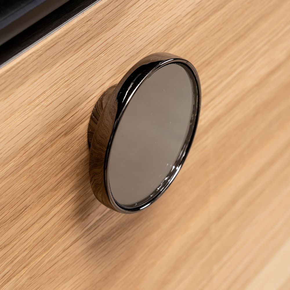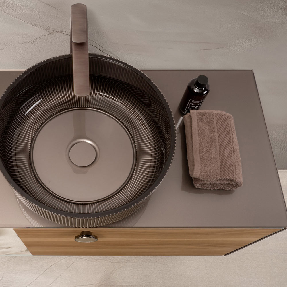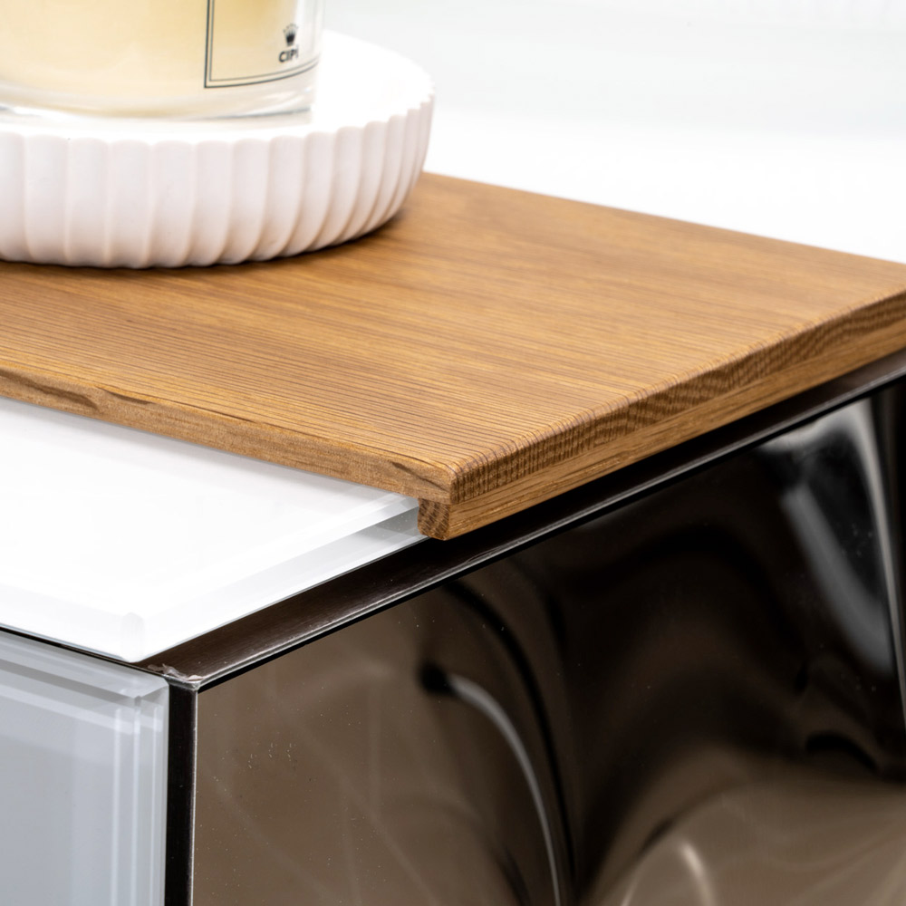Den centrala delen i naturträ med synlig ådring kombineras harmoniskt med toppen och sidorna, som är tillverkade av 8 mm extra klart härdat färgat glas . Lådans sidoinsats är i välvt glas , som kännetecknas av en tredimensionell effekt med lysande reflektioner, vilket berikar designen med en distinkt och förfinad detalj.