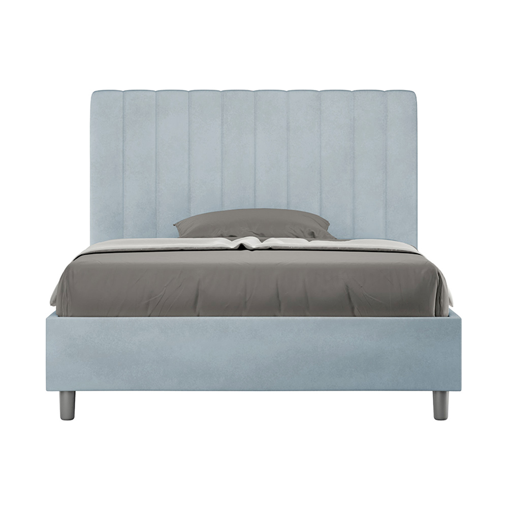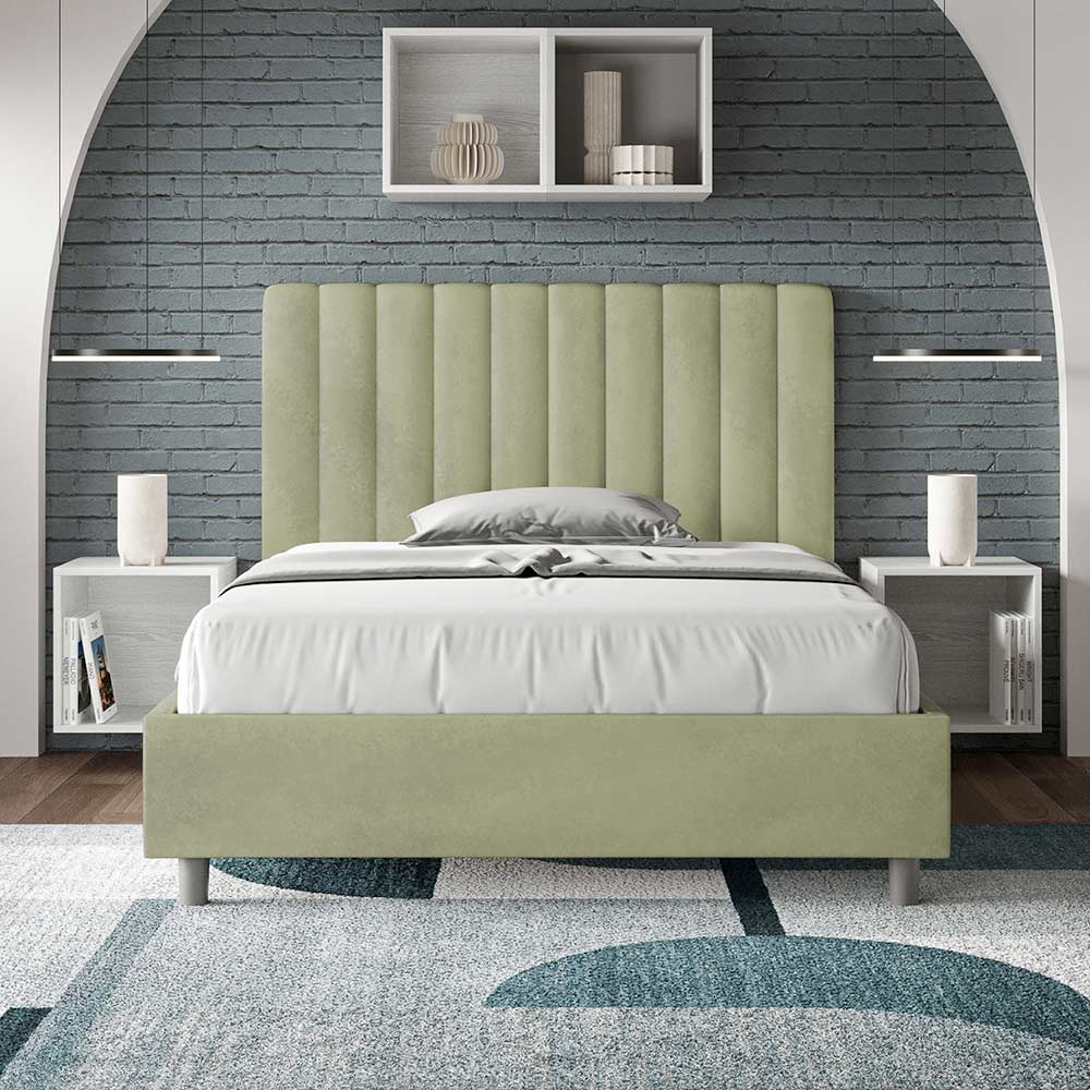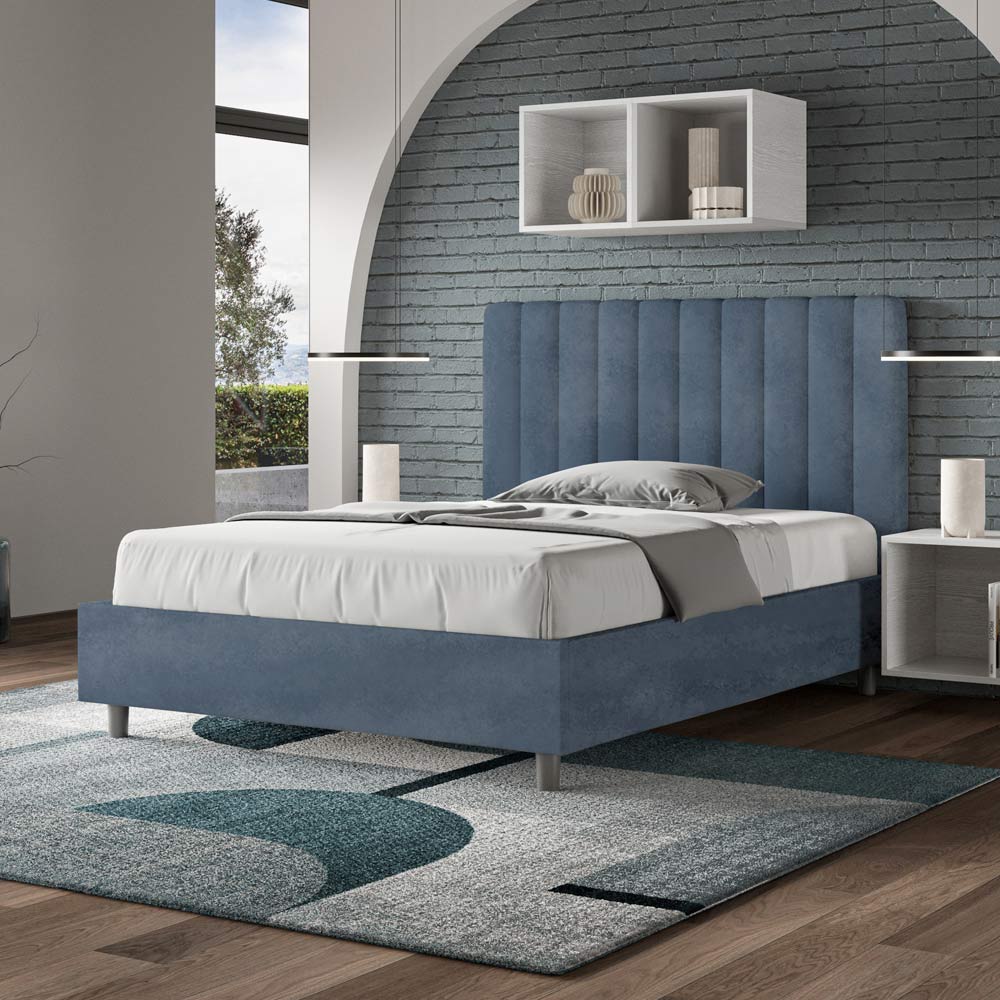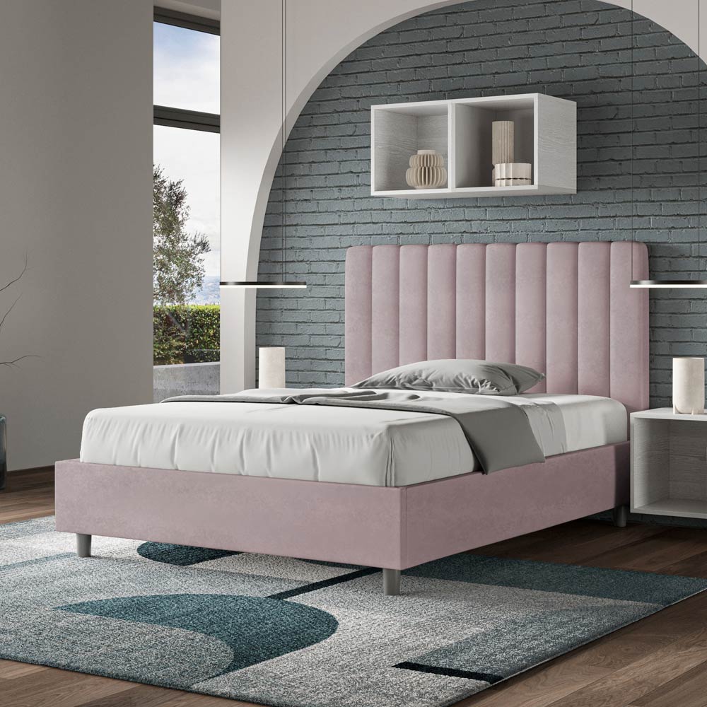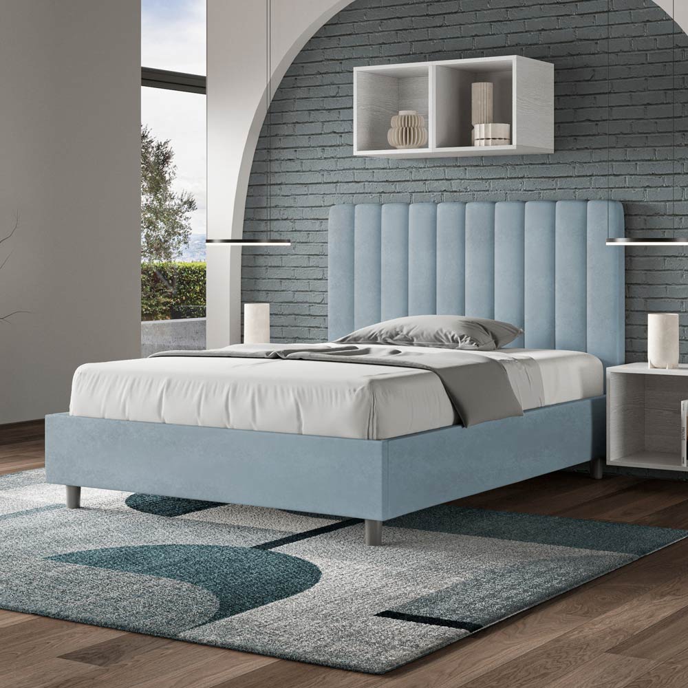Fransk säng 140x200 cm stoppad i melaminpaneler och klädd i mikrofiber , helt tillverkad i Italien. Denna franska säng med klädd sängram är perfekt för dig som söker ett iögonfallande inslag utan att vara överdrivet påträngande. Sängen har en minimalistisk huvudgavel med en delikat quiltad effekt av symmetriska vertikala linjer , som passar vackert in i alla miljöer, oavsett om de är moderna eller klassiska.