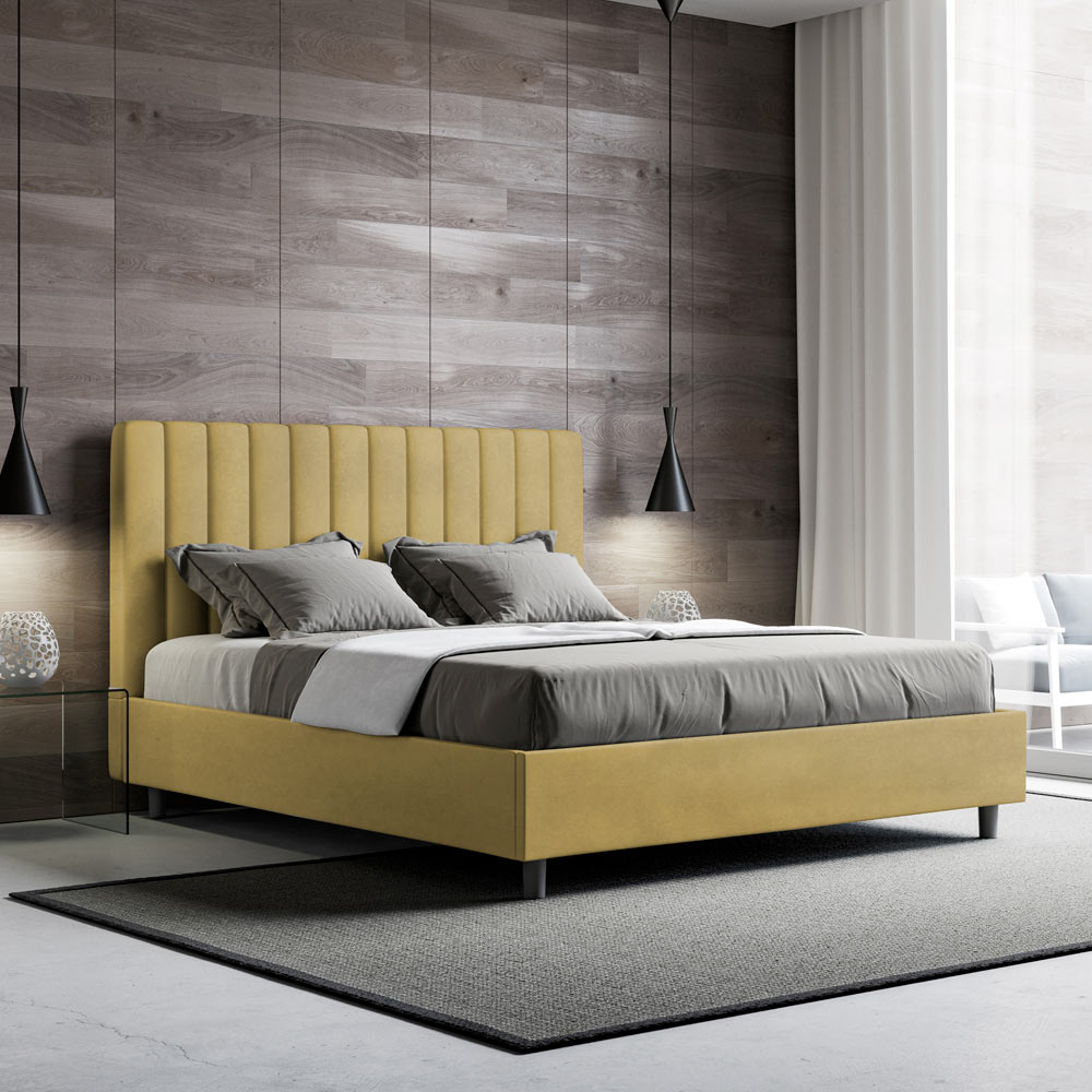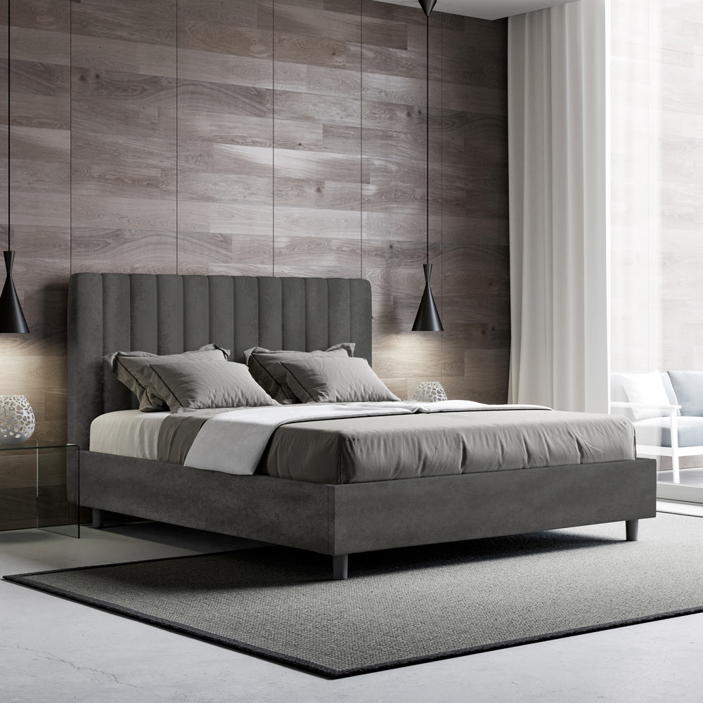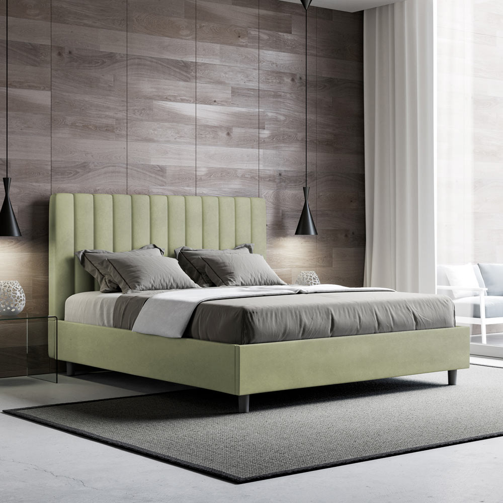 160x200 cm stoppad dubbelsäng tillverkad av spånskivor och klädd i mikrofiber , helt tillverkad i Italien. Denna dubbelsäng med klädd ram är perfekt för dig som söker ett iögonfallande inslag utan att vara överdrivet dramatisk. Sängen har en minimalistisk huvudgavel med en delikat quiltad effekt av symmetriska vertikala linjer , som passar vackert in i alla miljöer, oavsett om de är moderna eller klassiska.