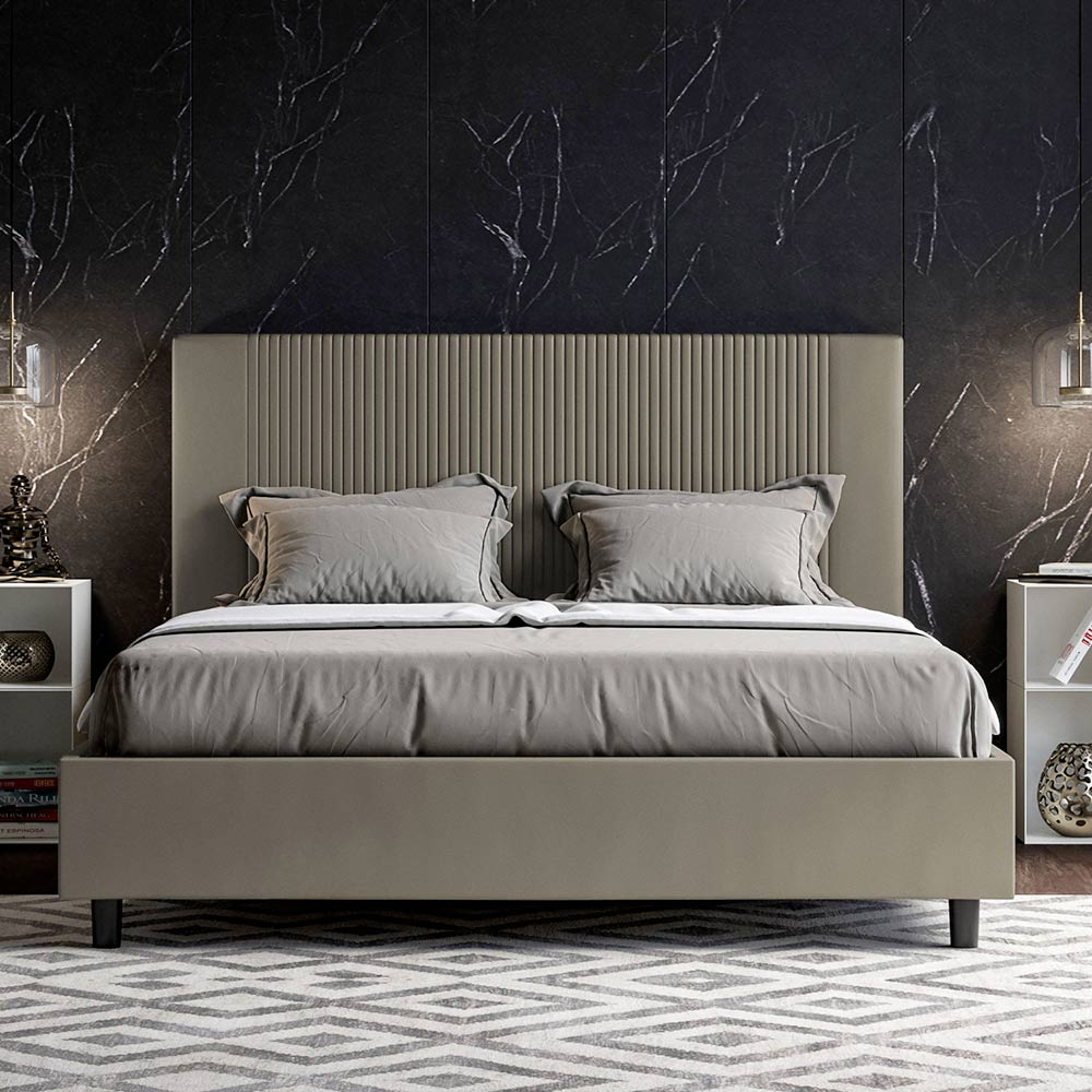 160x200 cm stoppad dubbelsäng tillverkad av spånskivpaneler och klädd i konstläder , helt tillverkad i Italien. Denna dubbelsäng, med sin stoppade sängram, är en italiensk produkt tillverkad av konstläder. Dess enkla men moderna design är perfekt för utrymmen som utmärker sig genom sofistikerad elegans. Huvuddraget hos denna modell är dess huvudgavel, prydd med ett vertikalt linjemotiv , perfekt för dem som vill kombinera den med visuellt slående utrymmen med framträdande väggar, samtidigt som de bibehåller en omisskännlig elegans.