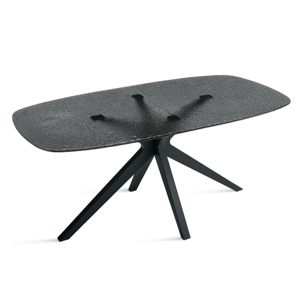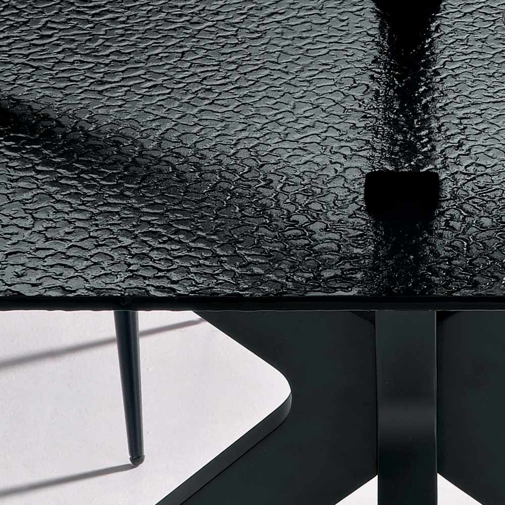 Den solida svartmålade metallbasen garanterar stabilitet och hållbarhet, och kompletterar designen med en modern och originell touch. Kombinationen av dekorerat glas och metallram skapar en perfekt balans mellan elegans och funktionalitet, vilket gör bordet lämpligt för både heminredning och moderna utrymmen.
