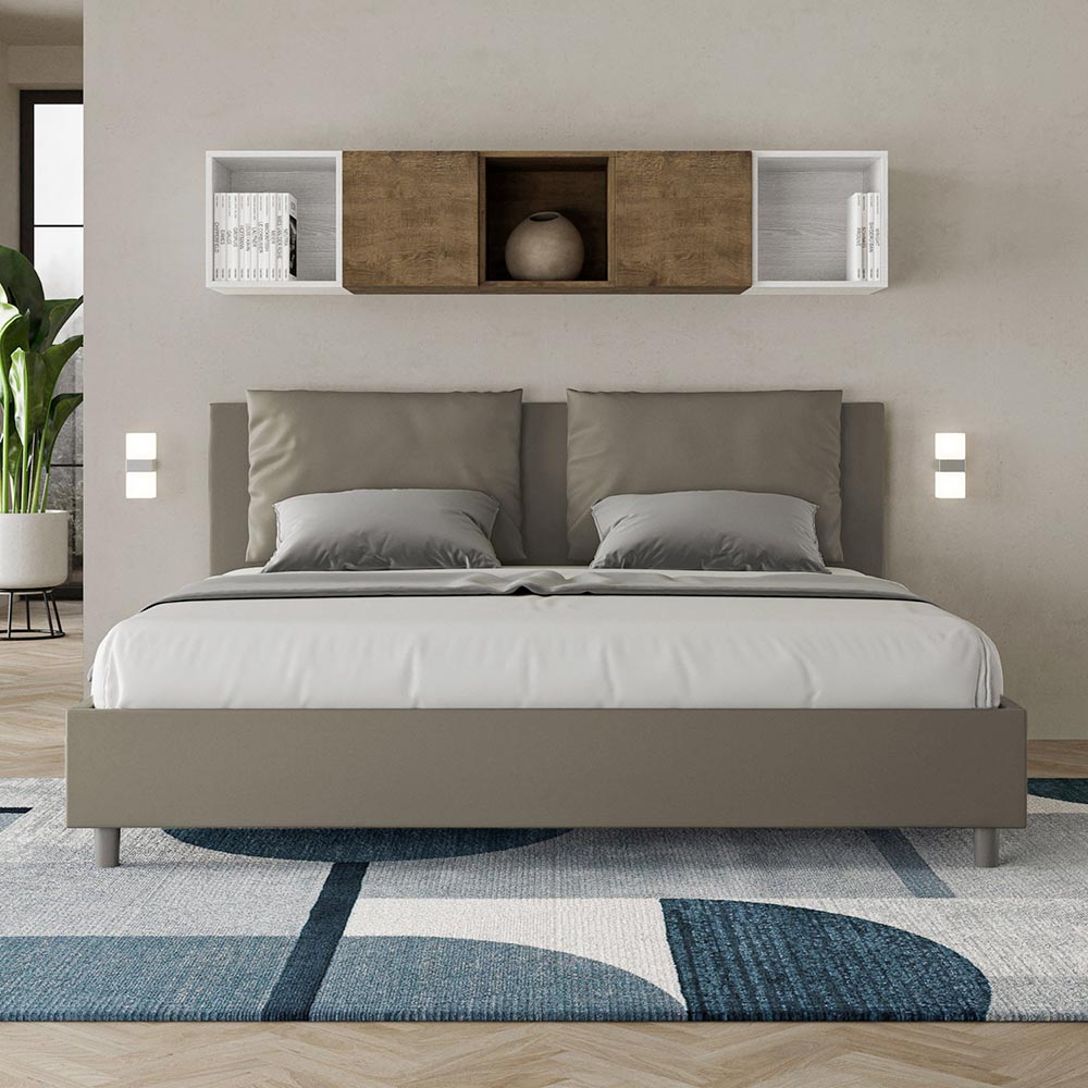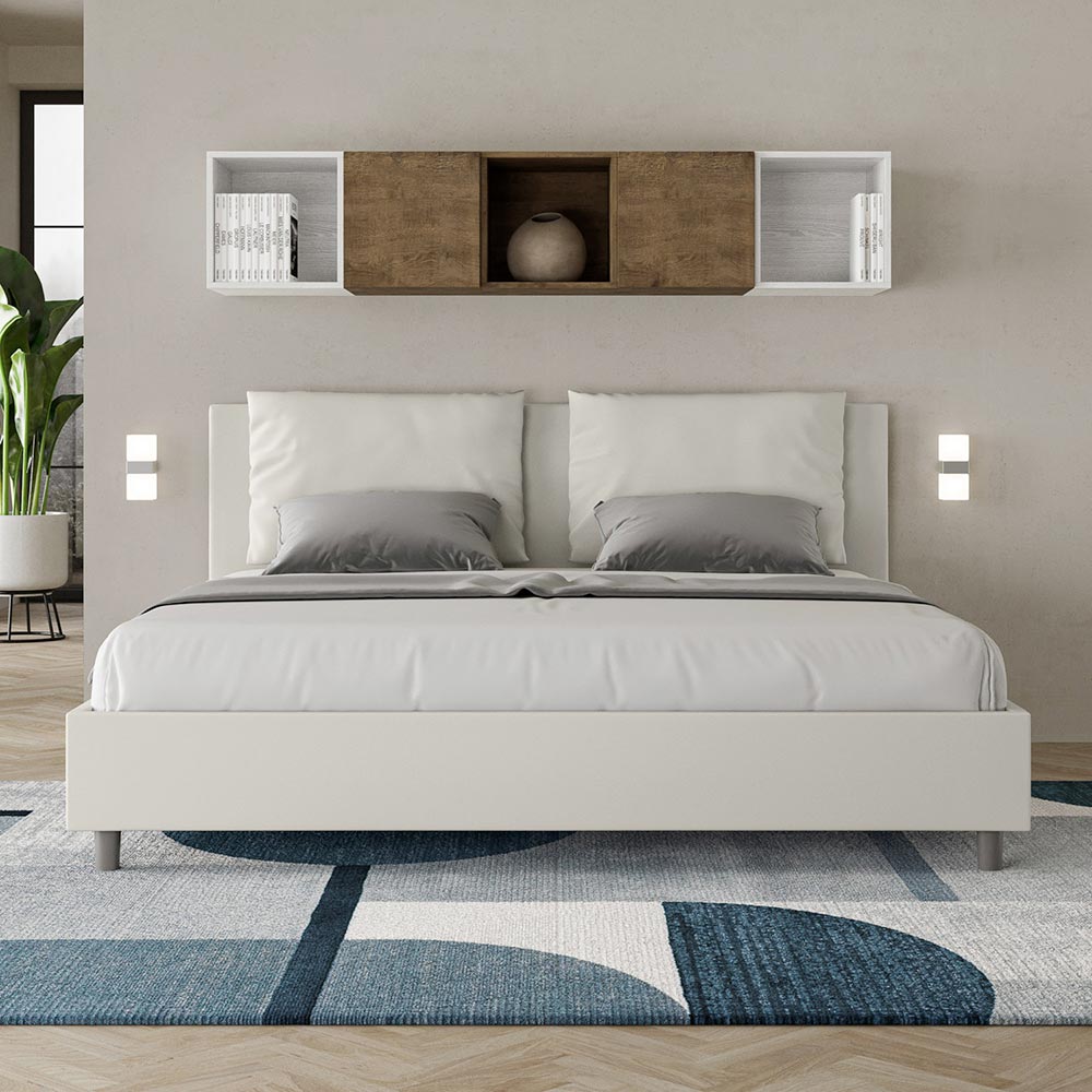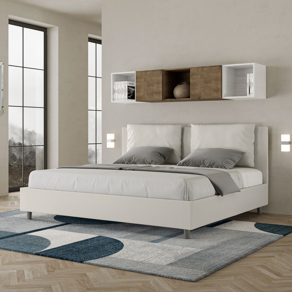 King size-säng 180x200 cm stoppad med melaminpaneler och klädd i konstläder , helt tillverkad i Italien. Denna king size-säng med klädd ram förkroppsligar perfekt fördelarna med en klädd säng: komfort, modern stil, funktionalitet och effektiv användning av utrymmet . Denna säng, med sin generöst vadderade huvudgavel , erbjuder en avkopplande hörna som är perfekt för att läsa eller titta på TV, vilket förbättrar ditt sovrum. Elegant och snygg, denna säng är klädd i konstläder, vilket gör rengöringen snabb och enkel: torka bara av den med en mikrofiberduk för att hålla den skinande fin.