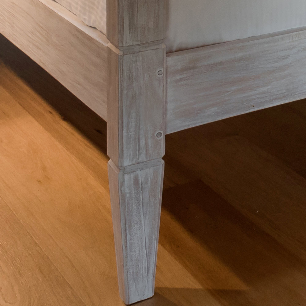 Sängen är handgjord av naturligt torkat trä, ett levande material som kan genomgå naturliga rörelser över tid. Eventuella hakar eller små sprickor är medfödda i träet och kan uppstå även med tiden.