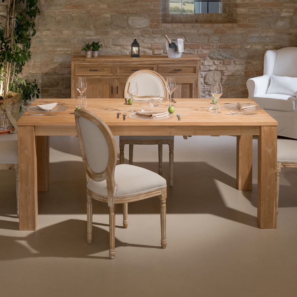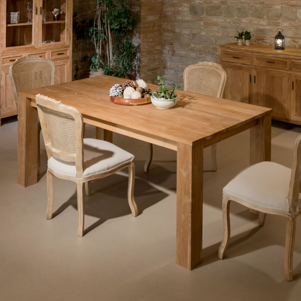 Detta fasta bord i massiv teak är ett robust och elegant möbel, perfekt för att ge stil till din matsal eller kök. Den robusta strukturen och hantverket framhäver träets naturliga ådring och skapar en varm och välkomnande atmosfär.