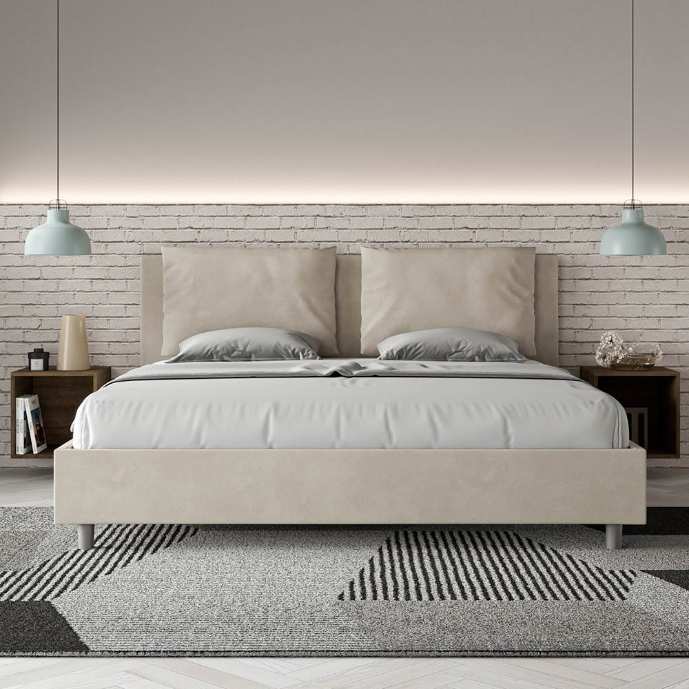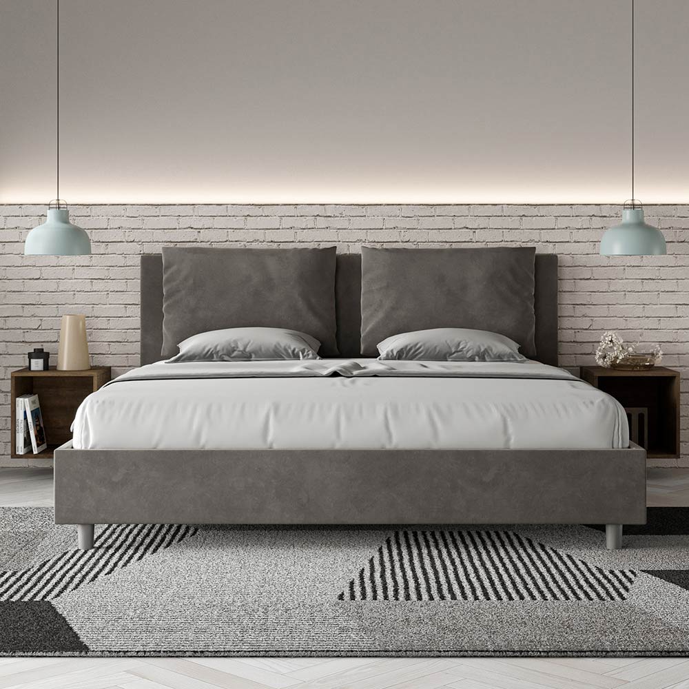 King size-säng 190x200 cm stoppad med melaminpaneler och klädd i mikrofiber , helt tillverkad i Italien. Denna king size-säng med klädd ram förkroppsligar perfekt fördelarna med en klädd säng: komfort, modern stil, funktionalitet och effektiv användning av utrymmet . Denna säng, med sin breda vadderade huvudgavel , erbjuder en avkopplande hörna som är perfekt för att läsa eller titta på TV, vilket förbättrar ditt sovrum. Elegant och snygg, denna säng är klädd i mikrofiber, vilket gör rengöringen snabb och enkel: torka bara av den med en mikrofiberduk för att hålla den skinande fin.