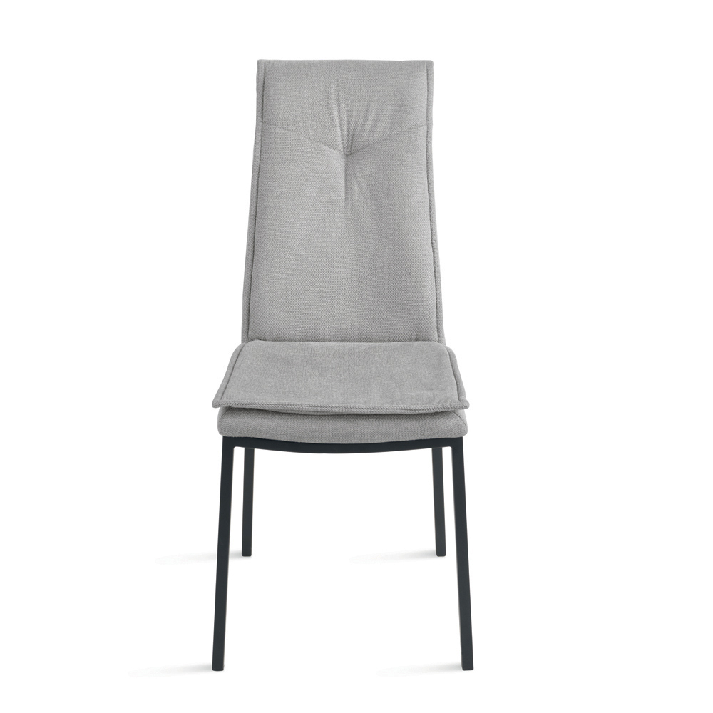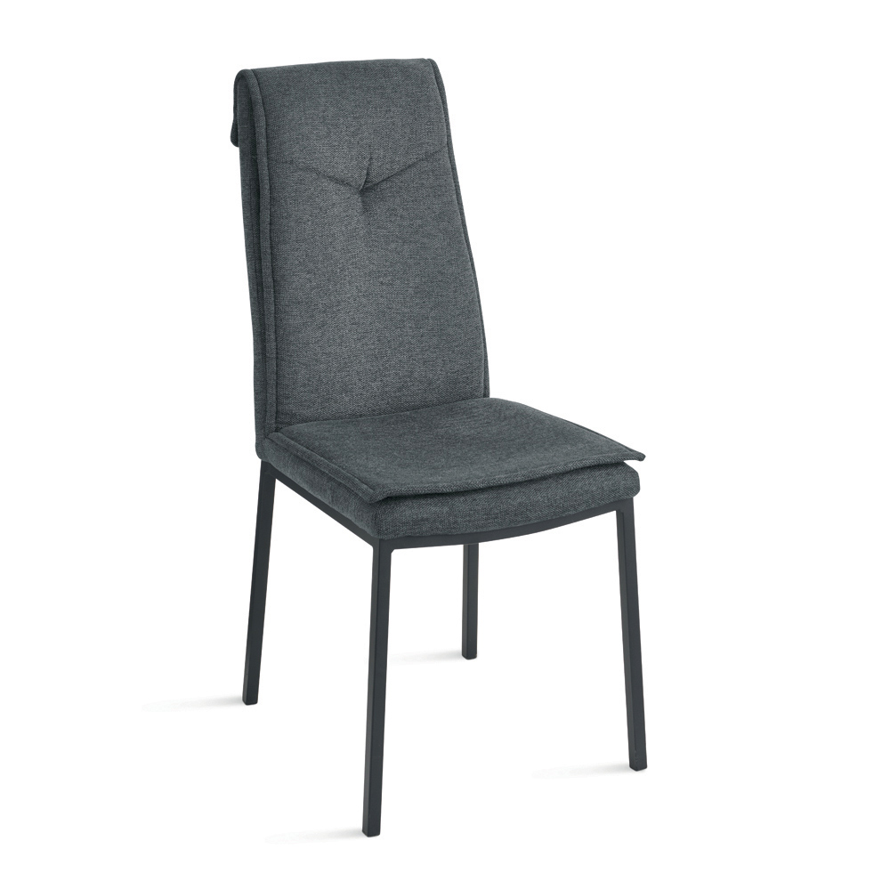 En elegant uppsättning av två stoppade stolar med modern design, perfekt för att elegant inreda din matsal , kök eller vardagsrum . Tygklädseln ger sitsen ett raffinerat och välkomnande utseende, perfekt för moderna och gemytliga miljöer.