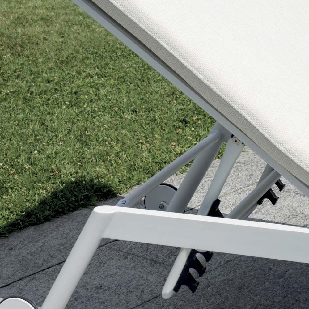 Denna solstol kombinerar komfort, elegans och praktiskhet och erbjuder den perfekta lösningen för att njuta av stunder av ren avkoppling utomhus. Tillverkad med en aluminiumram och hjul är den lätt, hållbar och enkel att flytta, perfekt för trädgårdar, terrasser och poolområden.