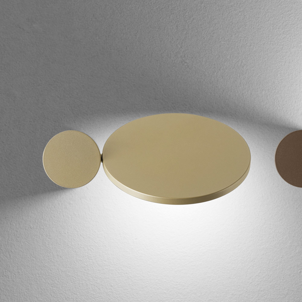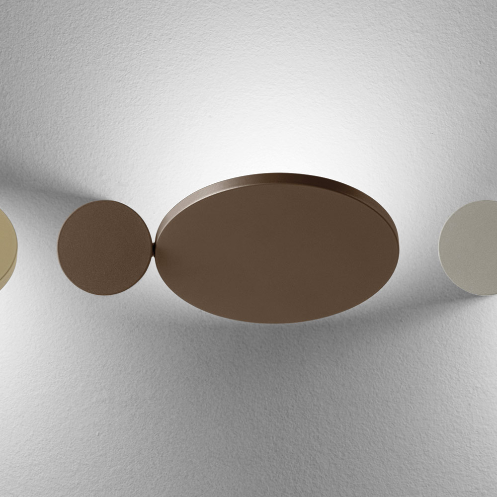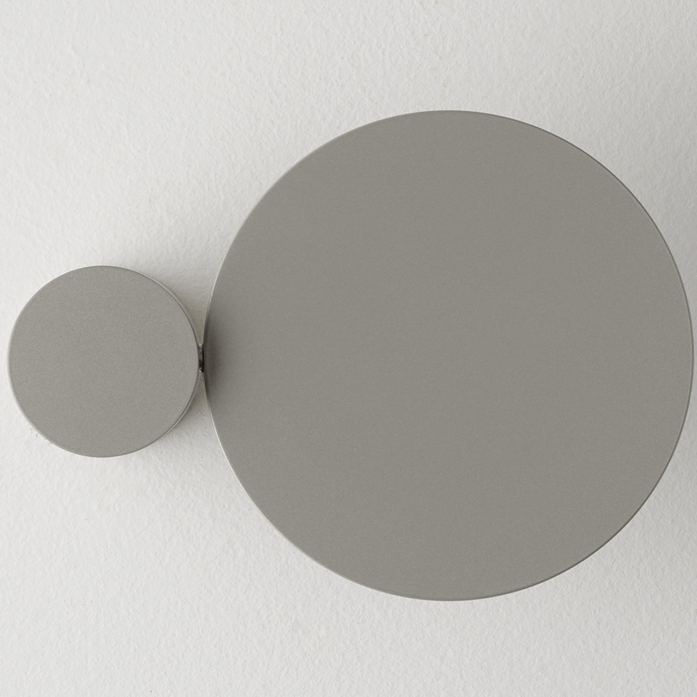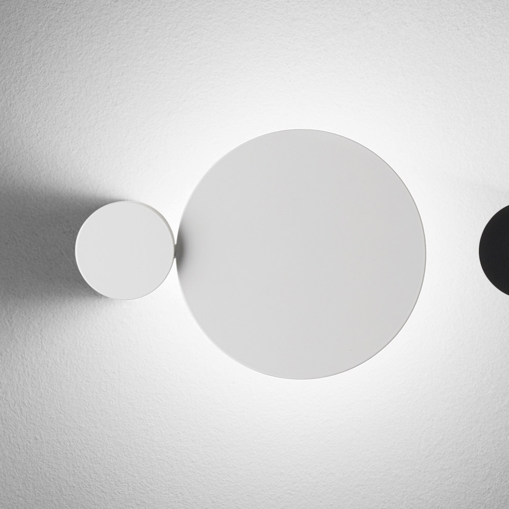 Denna vägglampa är ett sant lysande konstverk som blandar grafisk design och dekorativ funktion i en enda gest. Bestående av viktiga geometriska former leker den med överlappande skivor och ovaler som, när de tänds, skapar en mjuk och dramatisk ljuseffekt på väggen.