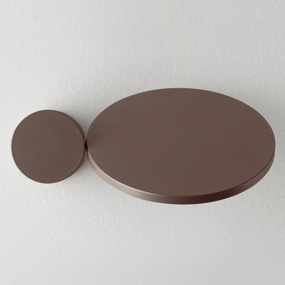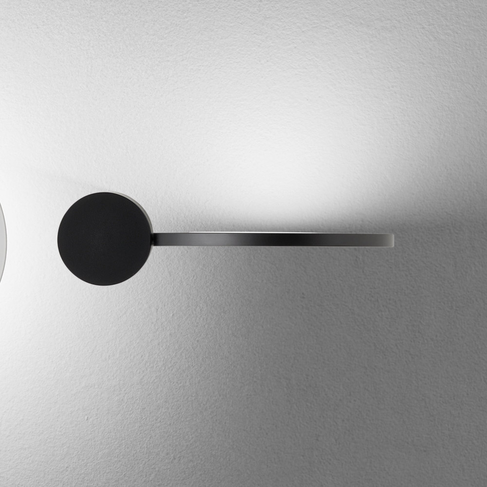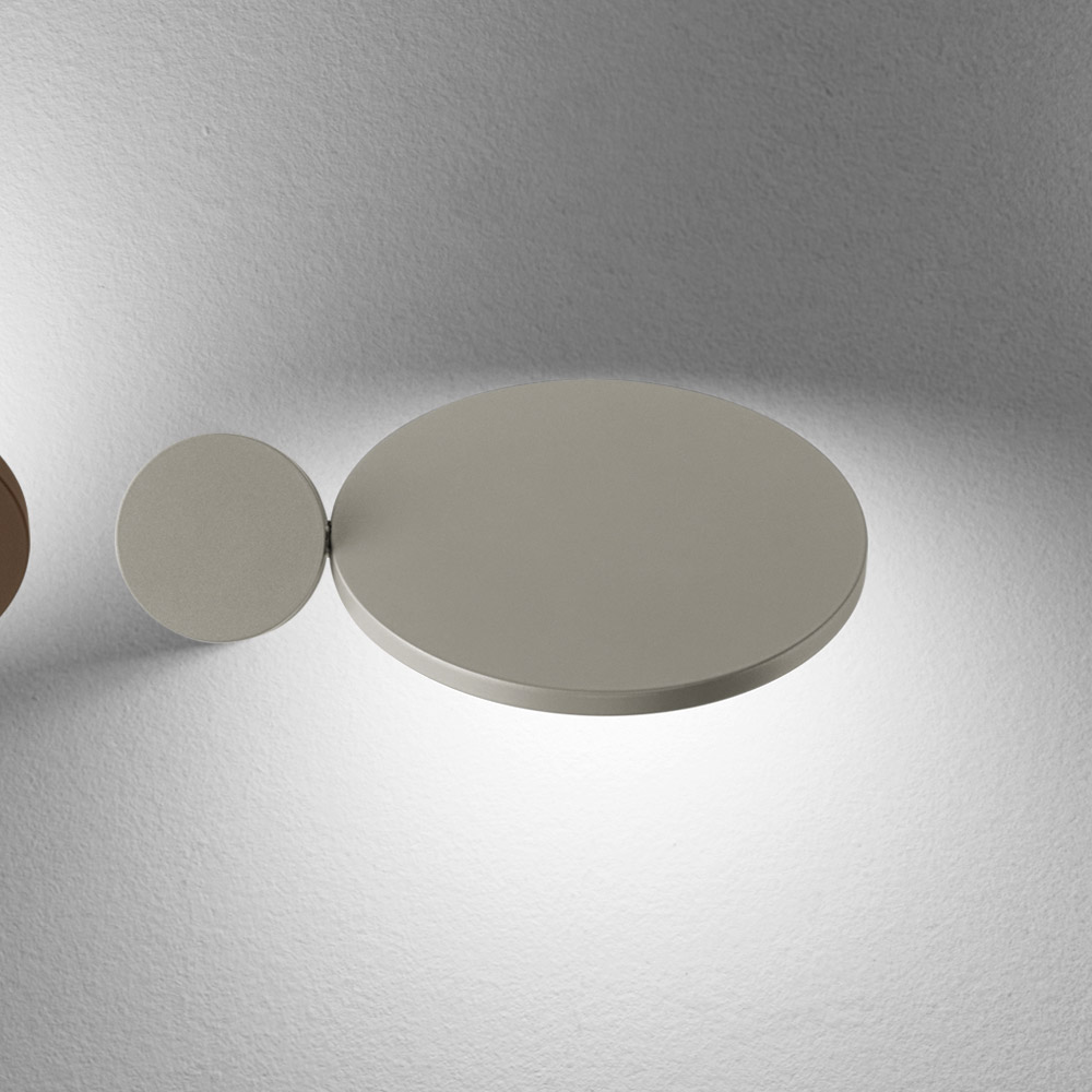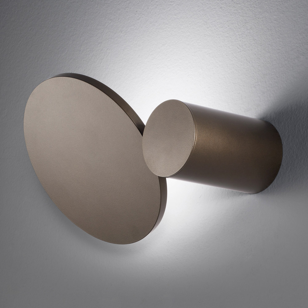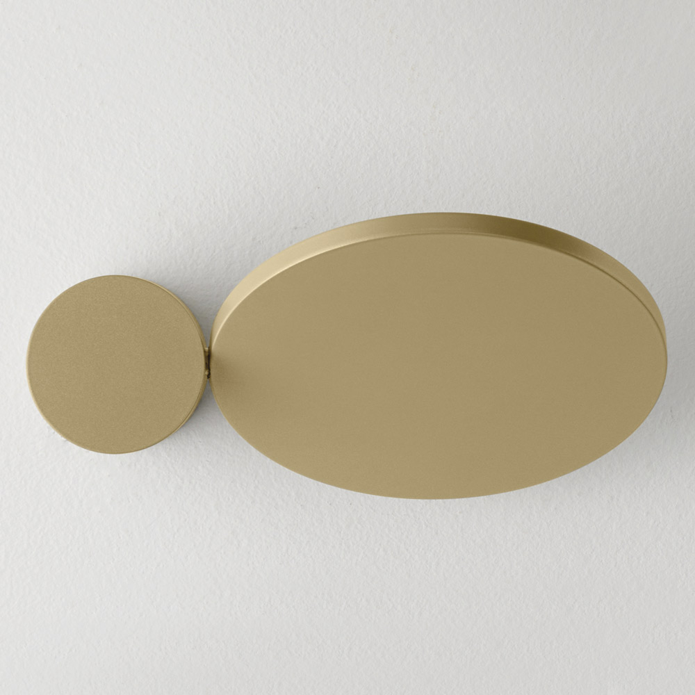 Denna vägglampa är ett sant lysande konstverk som blandar grafisk design och dekorativ funktion i en enda gest. Bestående av viktiga geometriska former leker den med överlappande skivor och ovaler som, när de tänds, skapar en mjuk och dramatisk ljuseffekt på väggen.