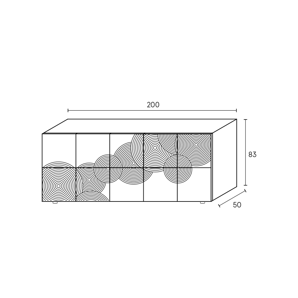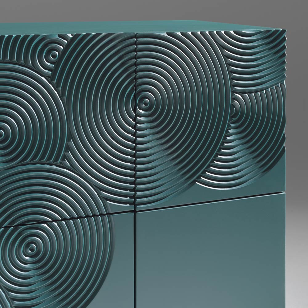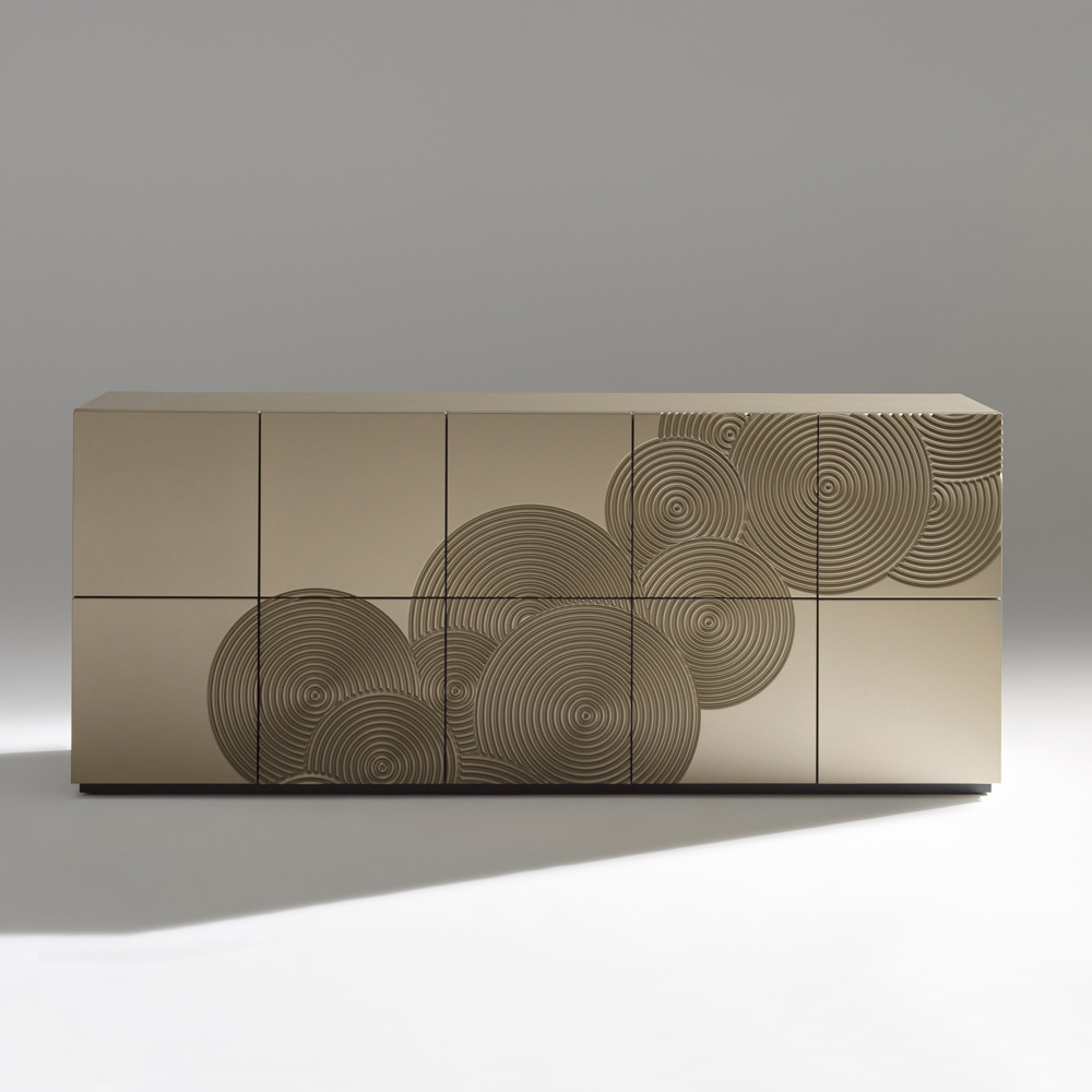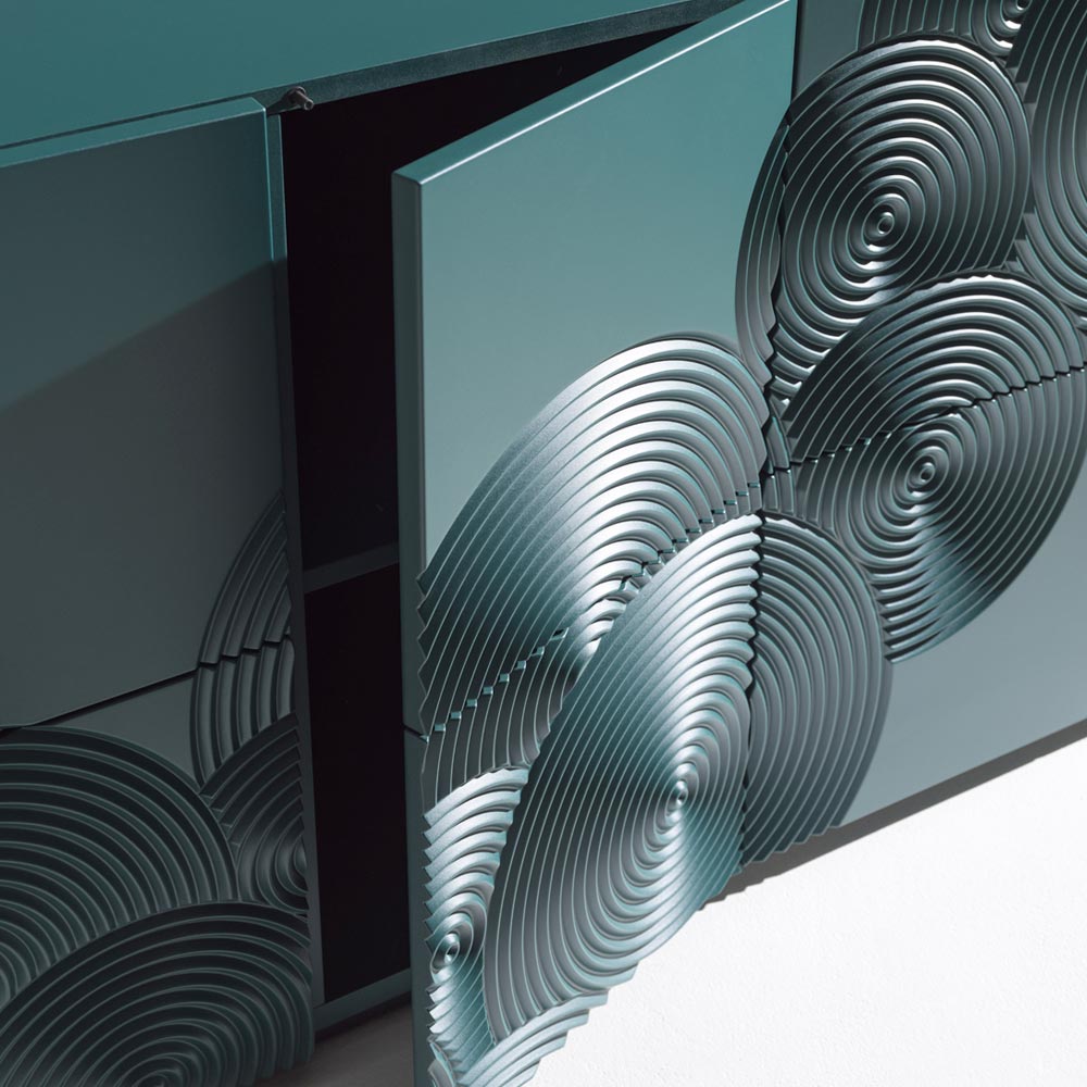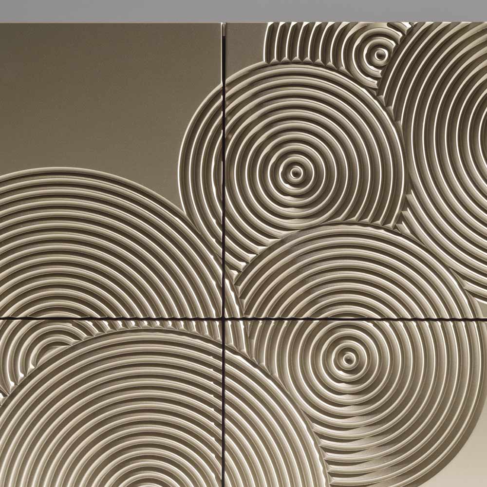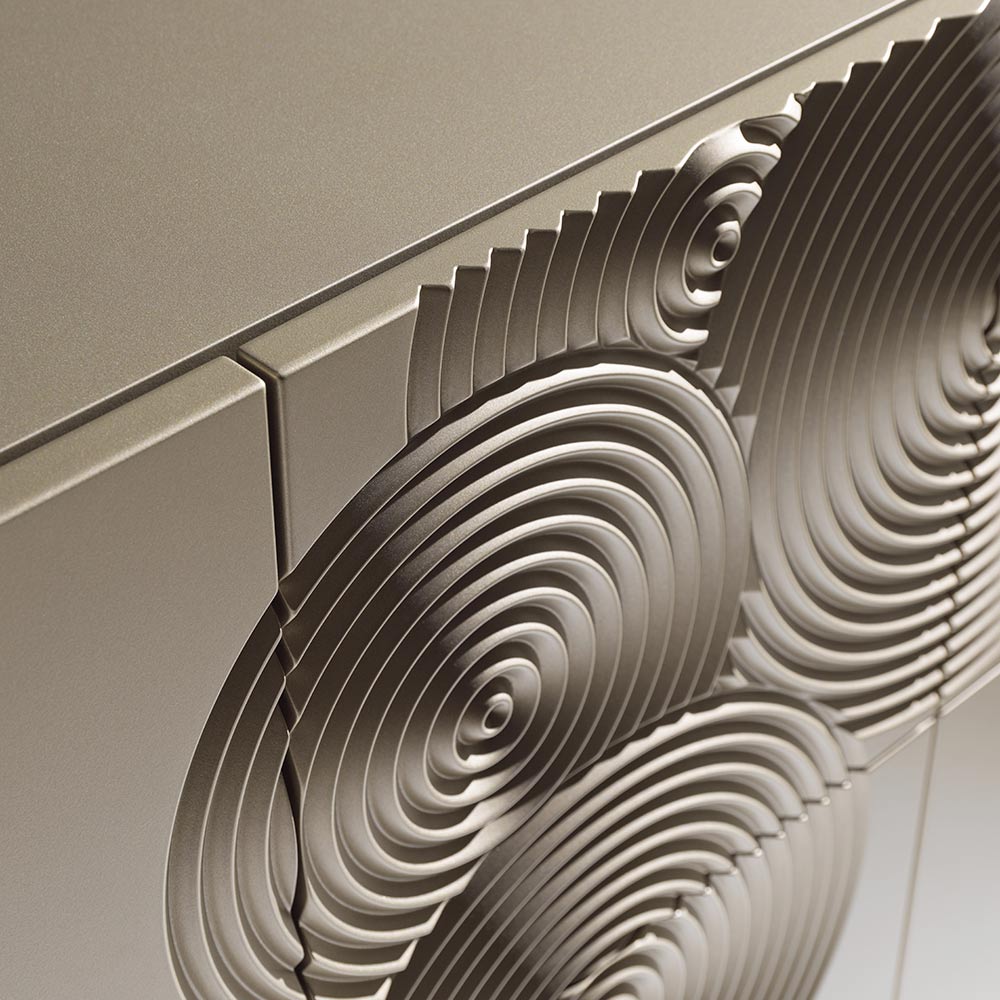 Ett skänk med stark visuell effekt, kännetecknat av en raffinerad dekoration graverad med ett cirkulärt motiv och färdigställd helt för hand , kapabelt att skapa suggestiva ljus- och skuggaspel på ytan.