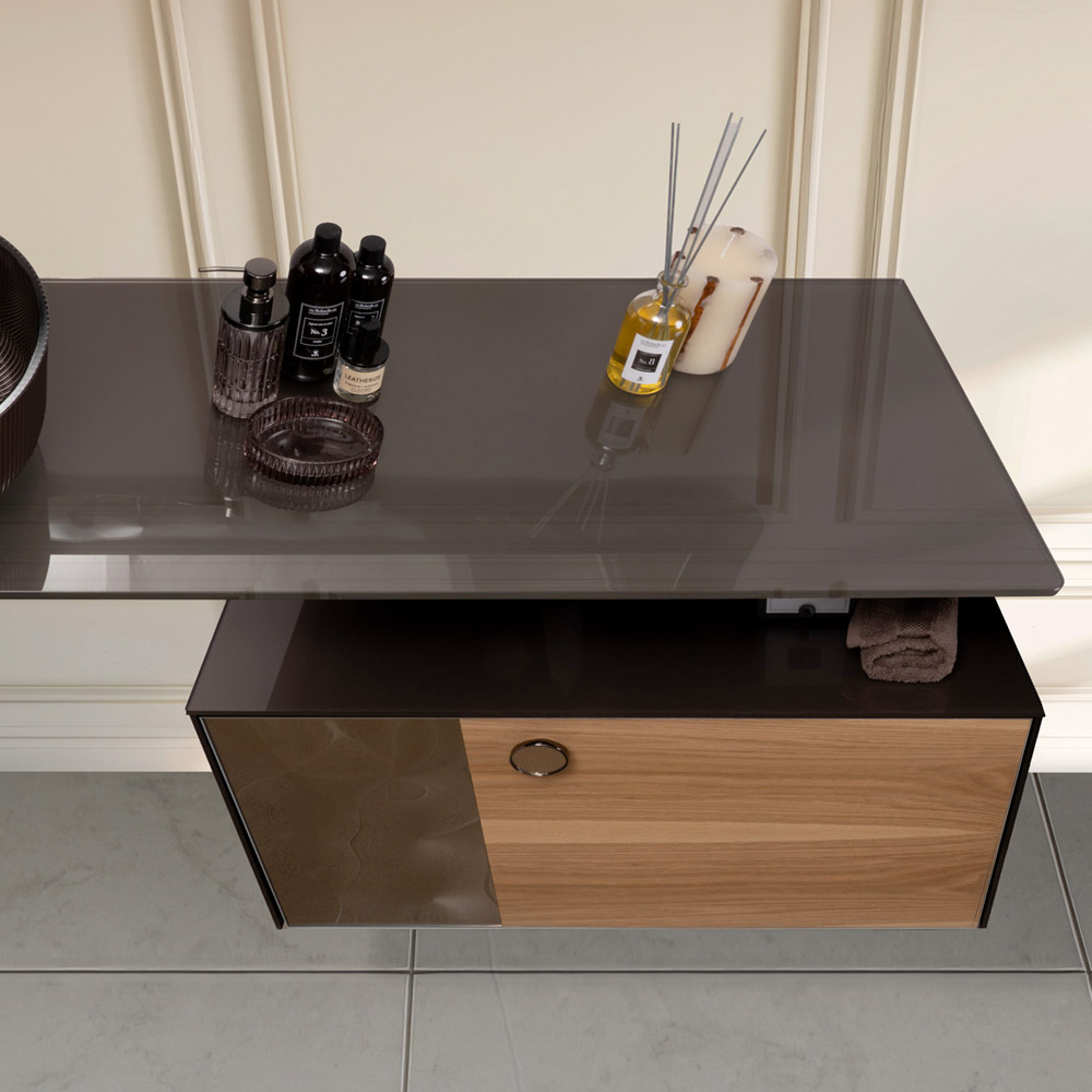 Den centrala delen i naturträ med synlig ådring kombineras harmoniskt med toppen och sidorna, som är tillverkade av 8 mm extra klart härdat färgat glas . Lådans sidoinsats är i välvt glas , som kännetecknas av en tredimensionell effekt med lysande reflektioner, vilket berikar designen med en distinkt och förfinad detalj.
