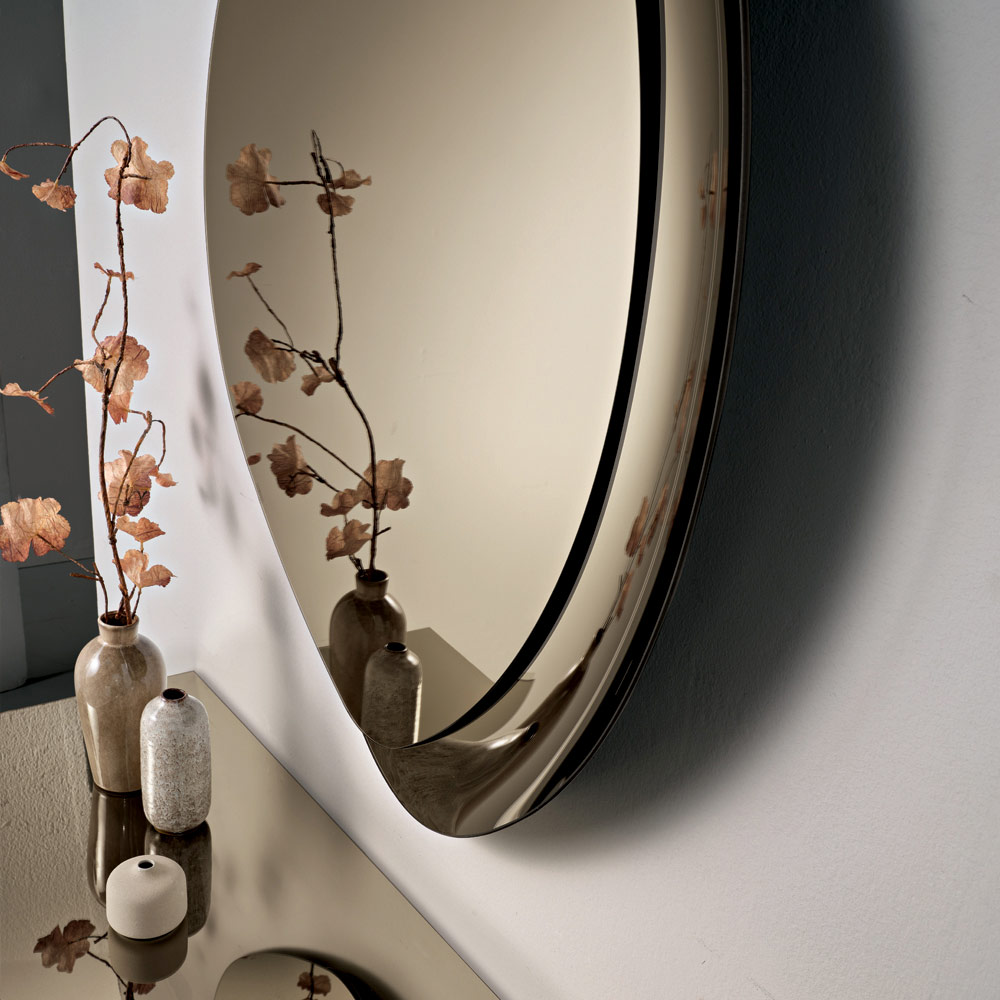 Designen har en distinkt halvram i ton-i-ton-färgat, sammansmält glas som delvis ramar in den reflekterande ytan. Denna detalj tillför textur och ljusstyrka , vilket skapar ett fängslande spel av reflektioner som ger spegeln djup och karaktär.