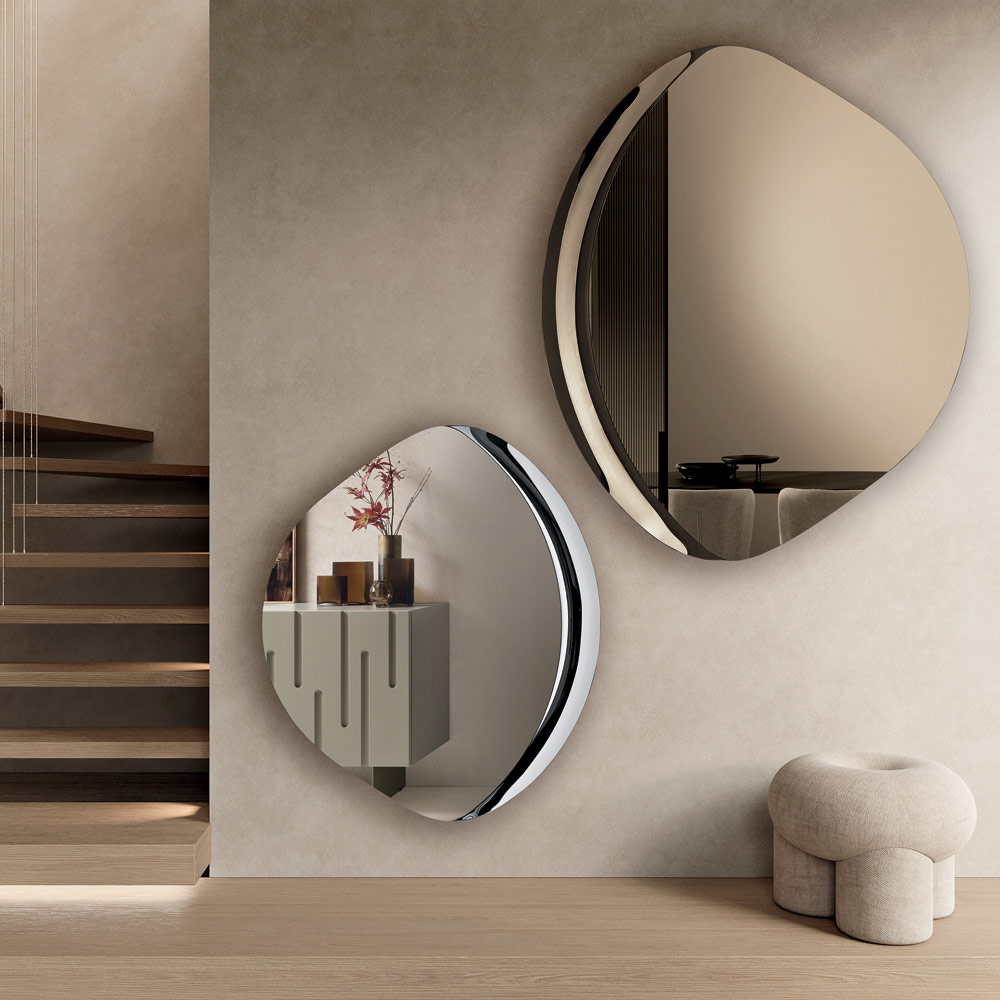 Tack vare sin skulpturala estetik och eleganta proportioner är denna spegel ett idealiskt inredningstillbehör för moderna och sofistikerade utrymmen, kapabel att förstärka ljuset och berika väggen med en touch av modern design.