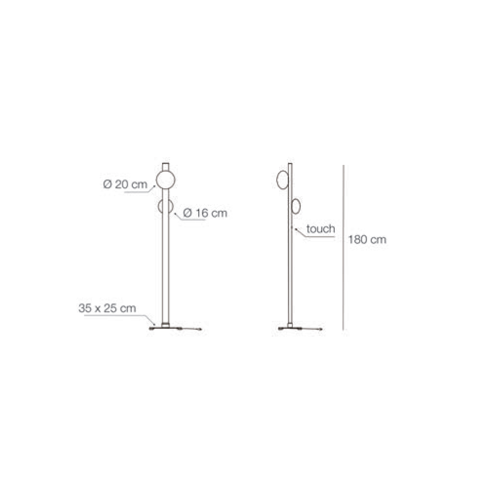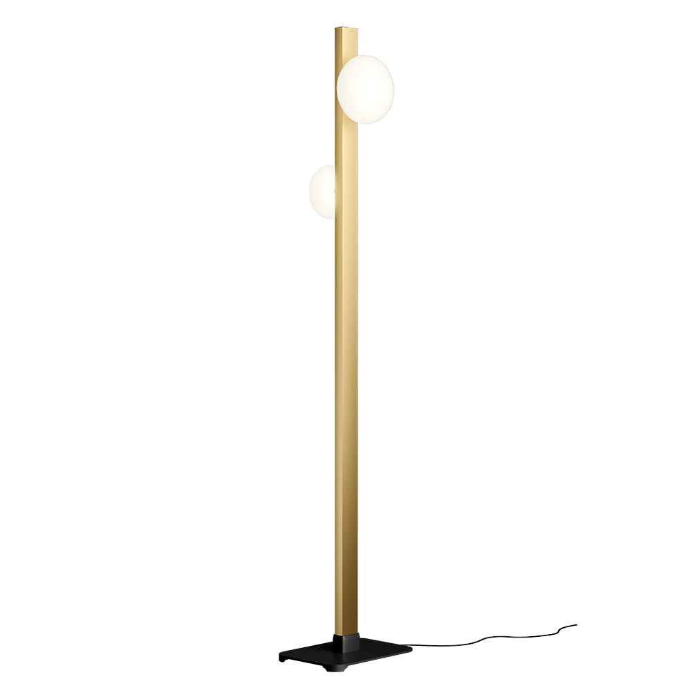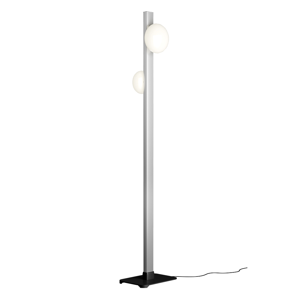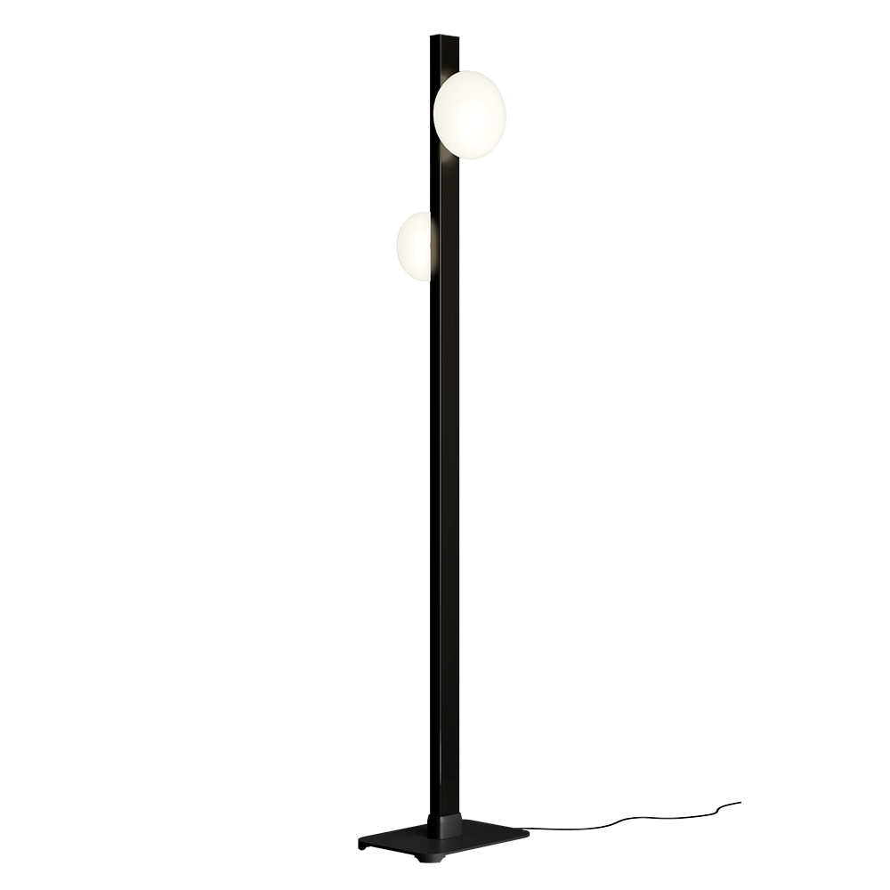 Denna golvlampa är en perfekt balans mellan skulptural design och funktionell elegans , idealisk för att förbättra vilket utrymme som helst med en modern och raffinerad stil. Den smala, geometriska vertikala strukturen rymmer två sfäriska opalglasdiffusorer , som ser ut att vara upphängda i perfekt balans och avger ett mjukt, omslutande ljus.