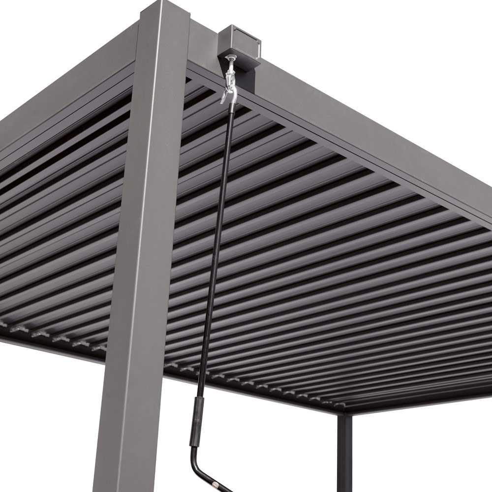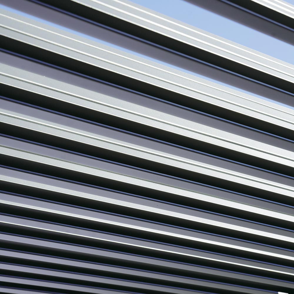 Stödstolparna i aluminium på 90 x 90 mm och takbalkarna på 120 x 30 mm / 147 x 30 mm ger en solid och pålitlig konstruktion. Det justerbara lamelltaket , som manövreras via en extern stålvev , gör att du enkelt kan justera ljusinsläpp och ventilation, vilket skapar den ideala miljön när som helst på dygnet.