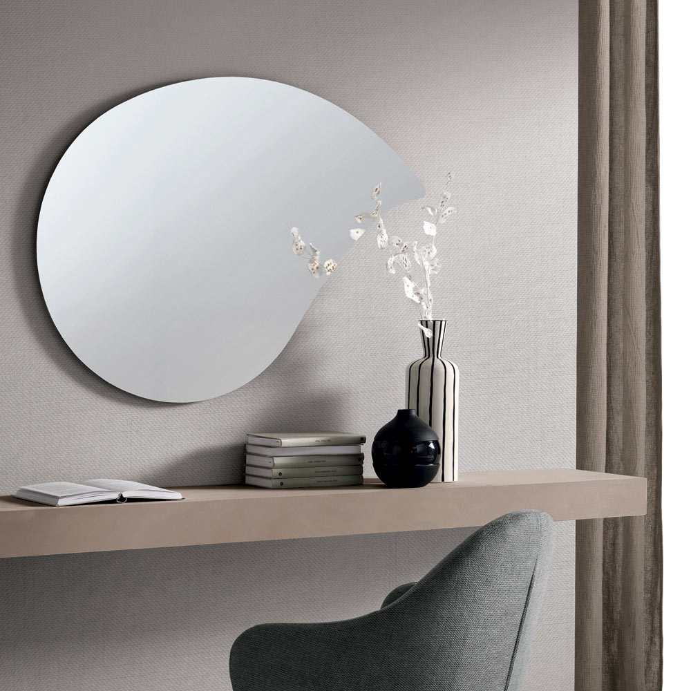 Den mjuka, avlånga formen ger spegeln ett lätt och harmoniskt utseende, som kan berika väggen med en raffinerad grafisk touch. Denna viktiga design gör att spegeln kan bli ett dekorativt element som kan förstärka ljuset och skapa djup i rummet.