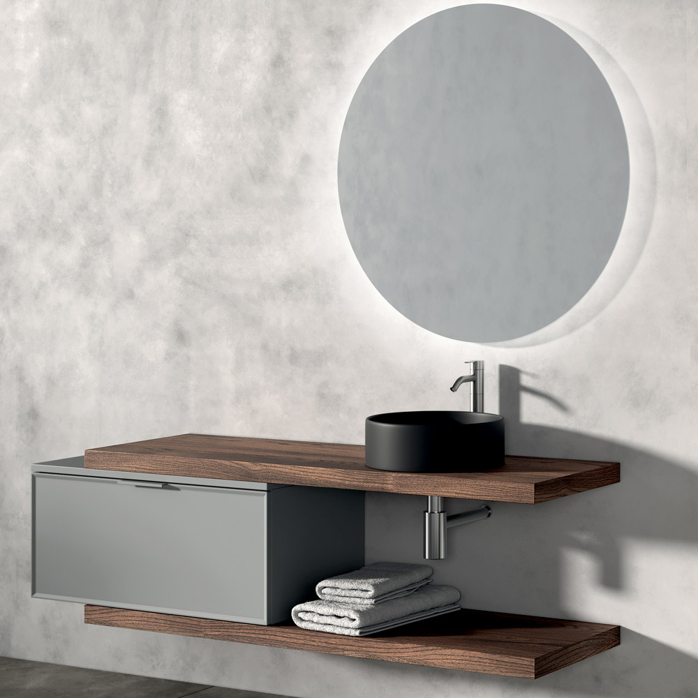 De två skivorna i Rio-ek introducerar ett naturligt och varmt element, vilket skapar en behaglig materialkontrast med det runda tvättstället i mattsvart keramik , kompositionens verkliga visuella huvudperson.