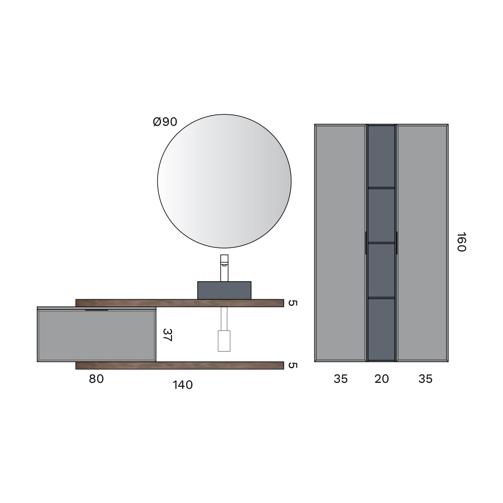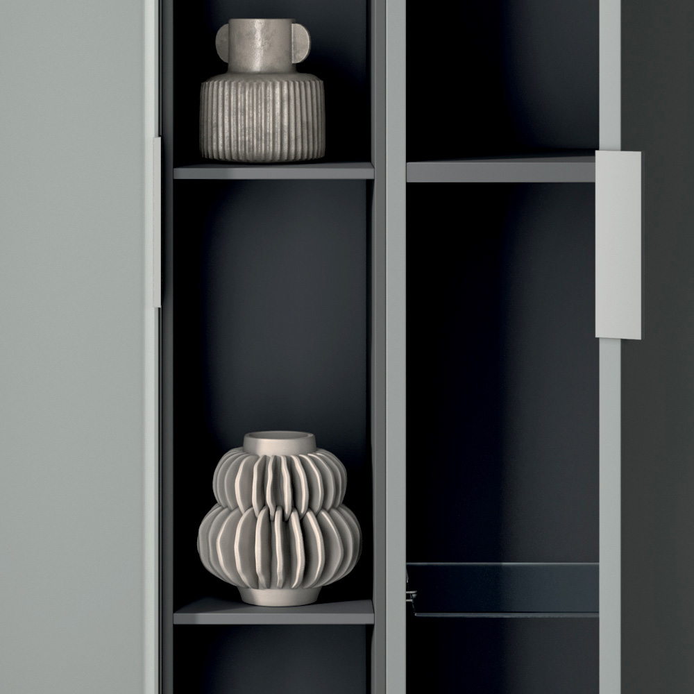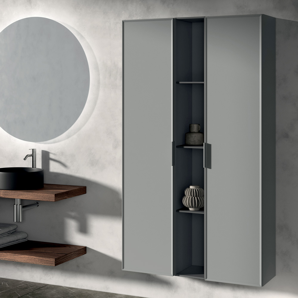 Kompositionen berikas av vertikala förvaringspelare och ett öppet element i antracit , perfekt för att organisera accessoarer och föremål samtidigt som en prydlig och modern stil bibehålls.