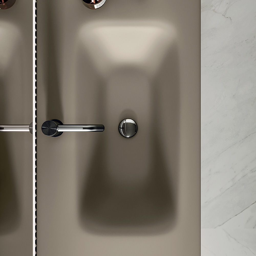 Vaskhållet i satinglas i duvgrått skapar ett raffinerat ton-i-ton-samspel med basen, vilket förstärker den visuella lättheten i hela kompositionen och ger ljusstyrka åt diskbänksområdet.