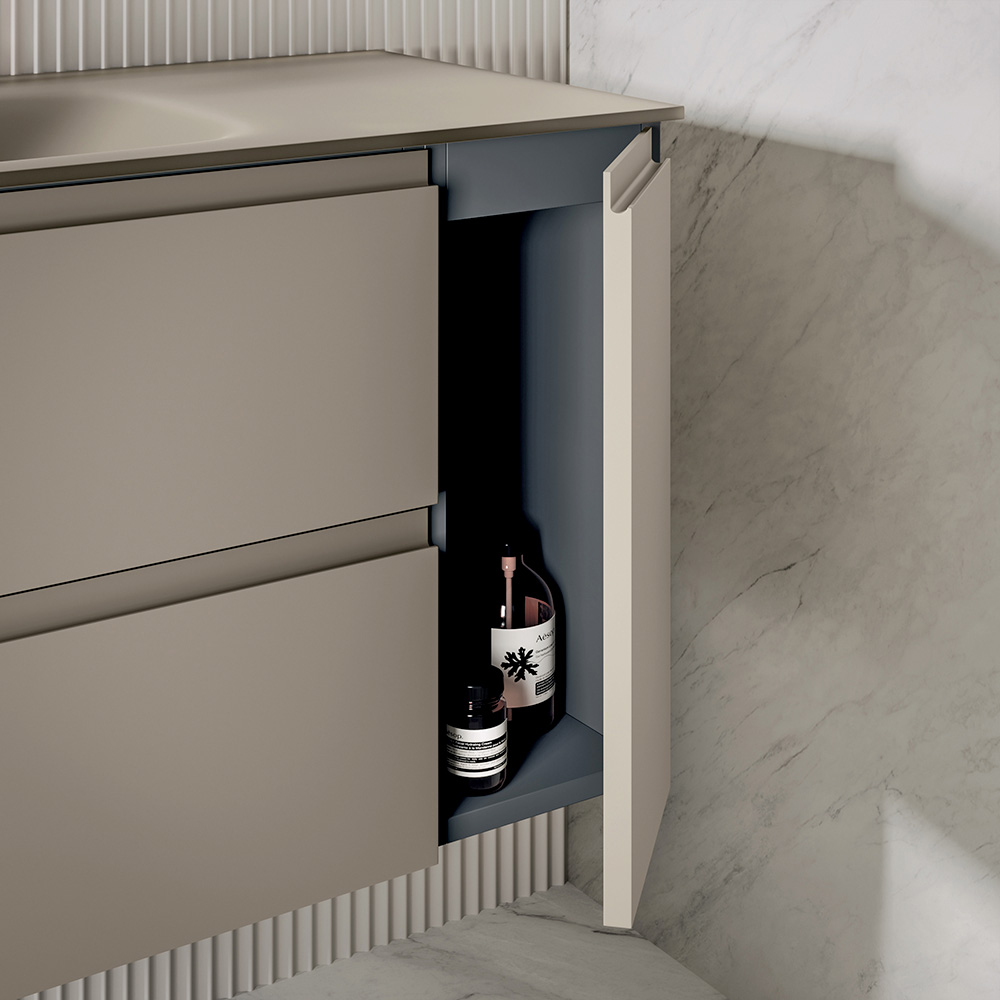 Underskåpet på 120 cm med två lådor och en dörr på höger sida i matt duvgrå finish erbjuder gott om förvaringskapacitet samtidigt som det bibehåller en elegant och modern estetik. Den integrerade dörrkonfigurationen säkerställer större funktionalitet och organisation av det inre utrymmet.