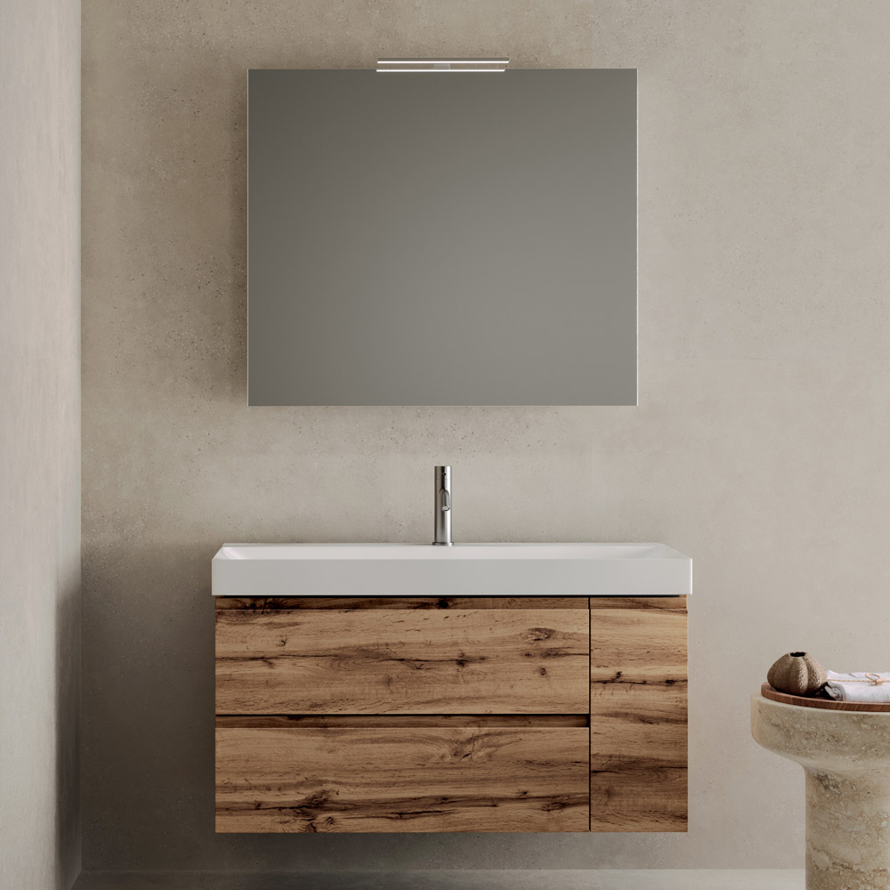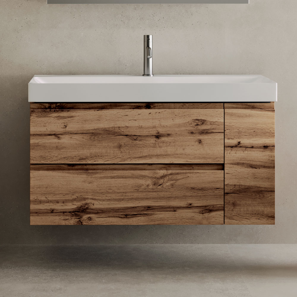 Underskåpet med två lådor och en sidodörr erbjuder funktionell förvaring, vilket säkerställer vardaglig praktiskhet och en ren estetik. De rena linjerna och den upphängda designen ljusar upp badrummet visuellt.