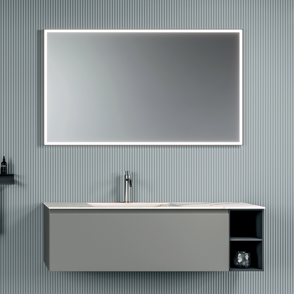 Kompositionen kompletteras av den bakgrundsbelysta LED-spegeln , utformad för att ge ett jämnt och omslutande ljus, perfekt för att förbättra badrumsutrymmet och säkerställa funktionell och elegant belysning.