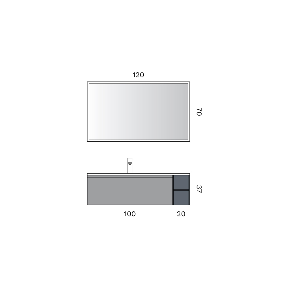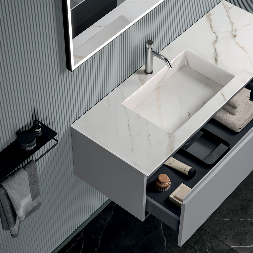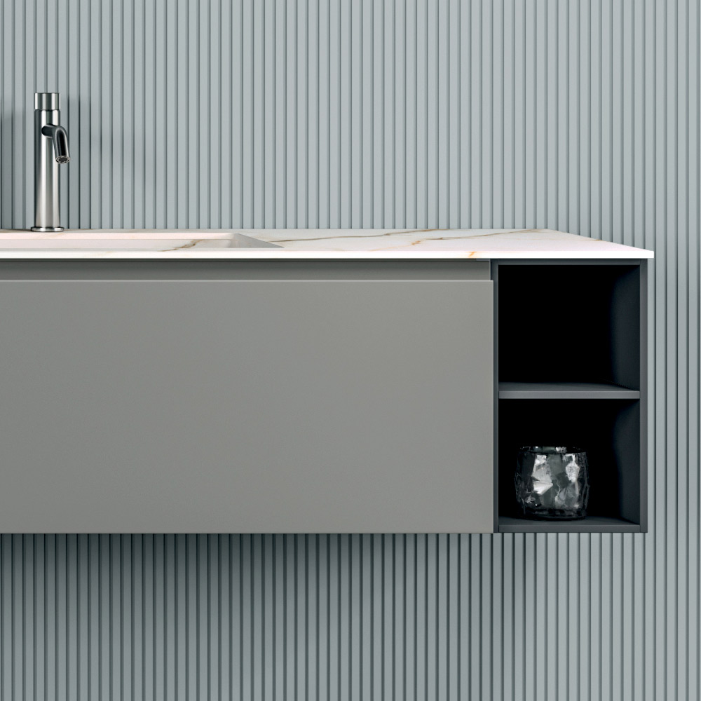 Den upphängda basen med stor korg , föreslagen i en mattgrå finish, garanterar en rymlig förvaringslösning samtidigt som den bibehåller en elegant och prydlig estetik.