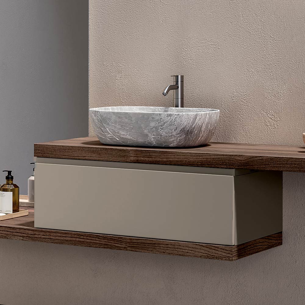 En komplett badrumslösning designad för dig som vill ha ett modernt, upphängt badrumsskåp , kännetecknat av varma ytbehandlingar, delikata kontraster och en stark estetisk identitet.