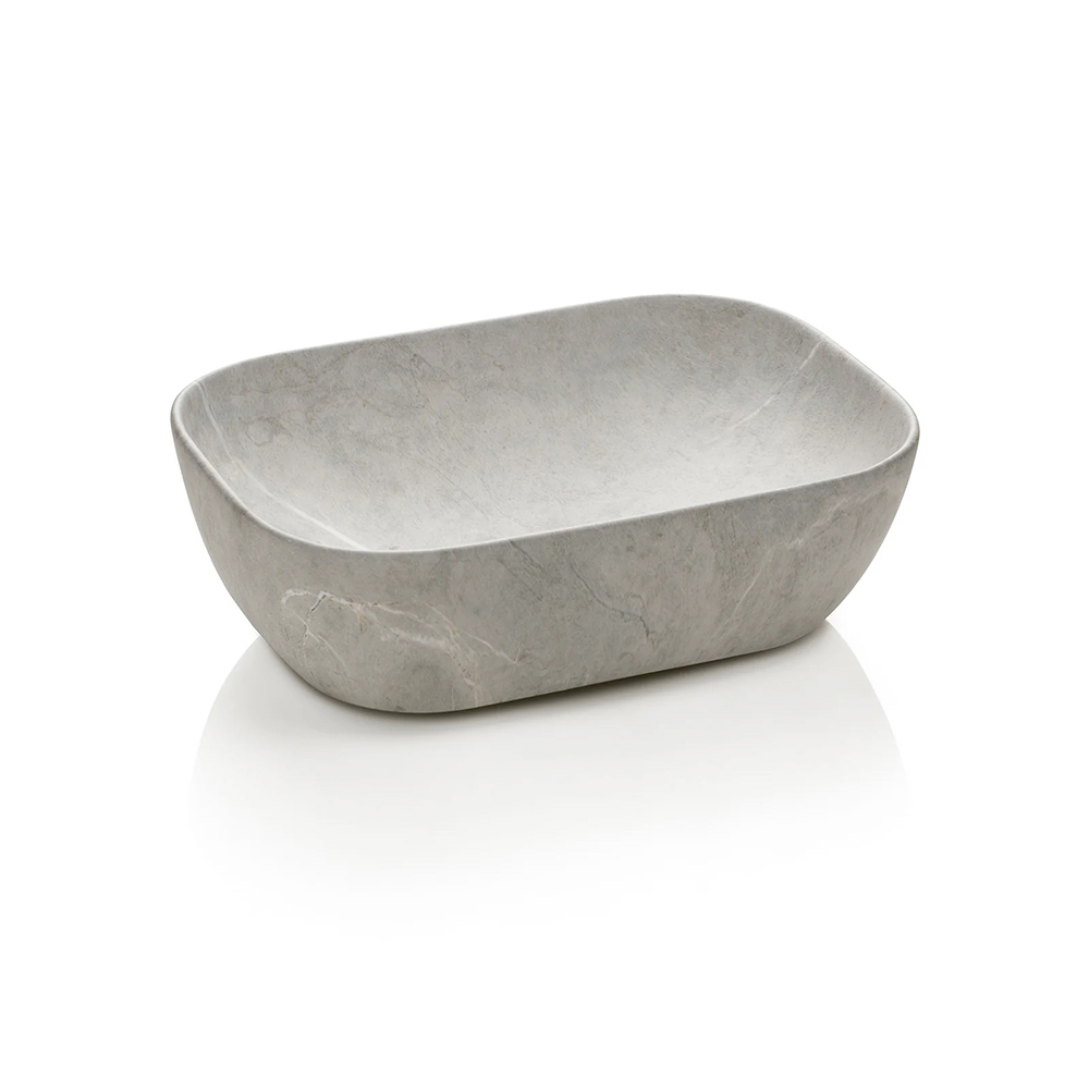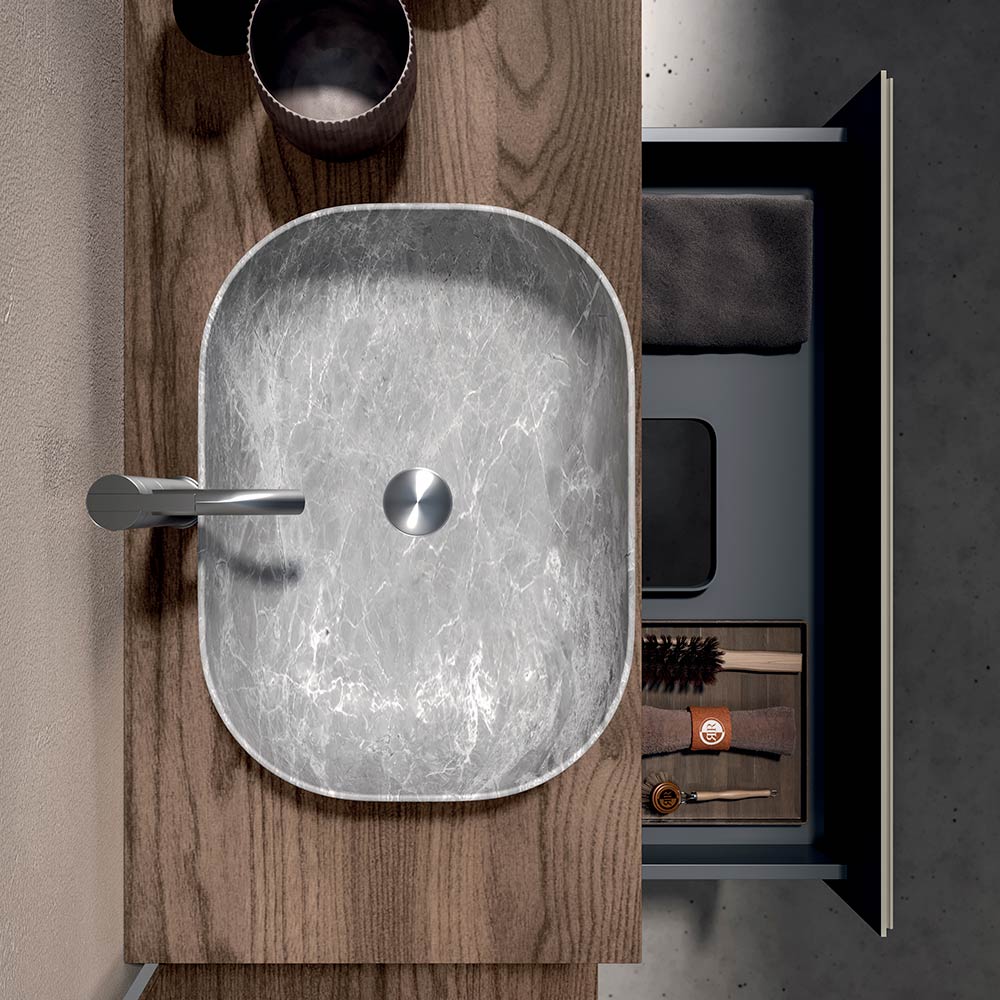 Det grå stenkeramikhandfatet ger en sofistikerad touch av materialitet: kompakt, funktionell och perfekt integrerad i kompositionen, kombinerar det motstånd och stil i ett enda element.