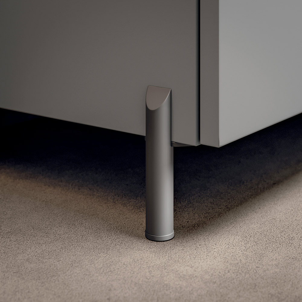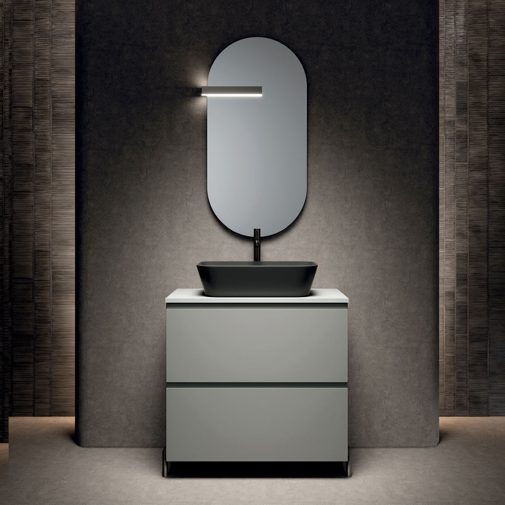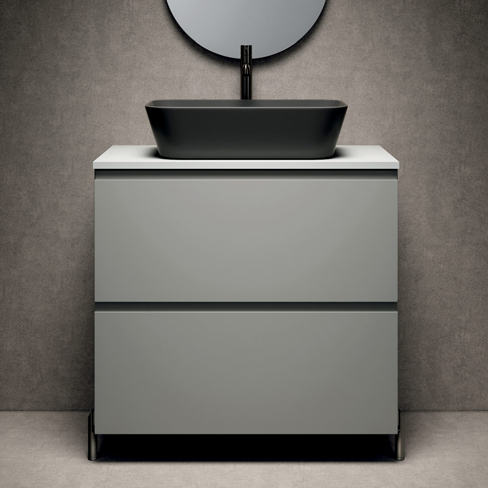 En lösning designad för dig som vill ha ett modernt badrumsskåp med ben , kännetecknat av trendiga matta ytor och antracitfärgade detaljer med en stark estetisk effekt.