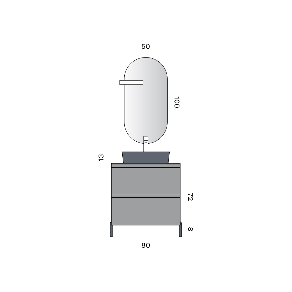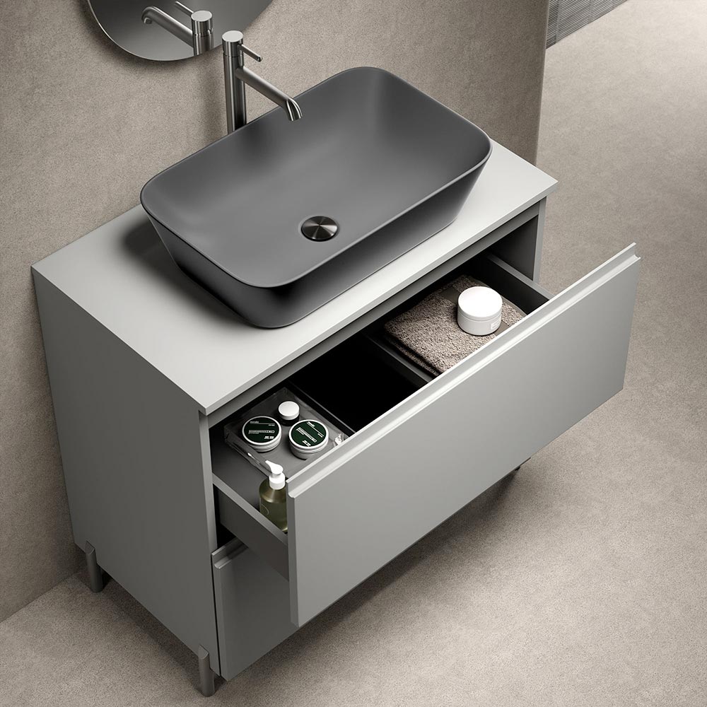 Basen med två stora lådor i mattgrå finish garanterar gott om förvaringsutrymme och en ren estetik, förstärkt av de 8 cm höga antracitfärgade utvändiga fötterna som ger visuell lätthet och större stabilitet.