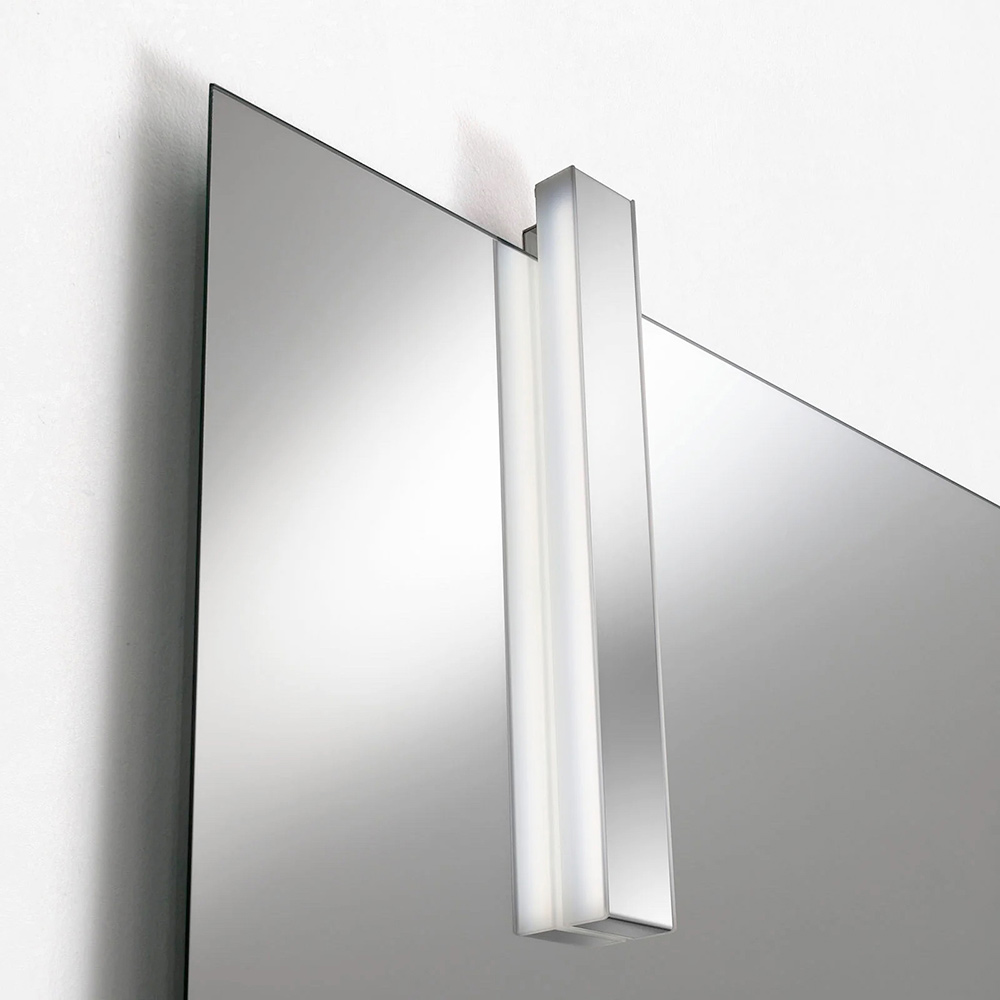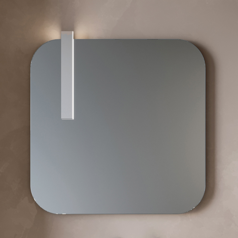 Den formade spegeln ger karaktär och personlighet till kompositionen, medan LED-lampan med kromfinish säkerställer elegant och funktionell belysning, perfekt för diskbänksområdet.