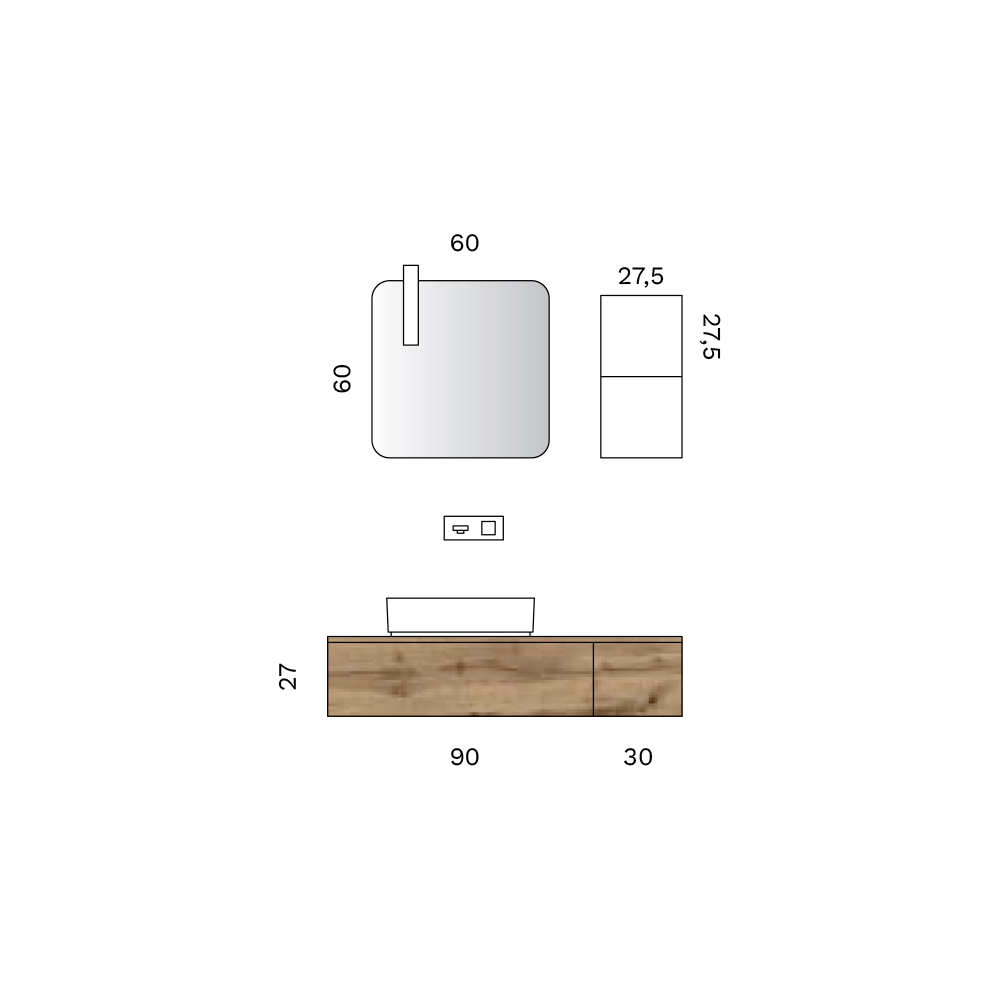 Strukturen består av upphängda underskåp med lådor , utformade för att säkerställa funktionell rymdhantering och perfekt organisering av tillbehör. Den integrerade sifonen upprätthåller en ren, minimalistisk linje, vilket förstärker den formella balansen i den övergripande designen.