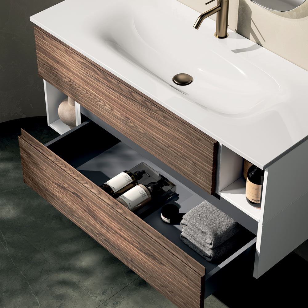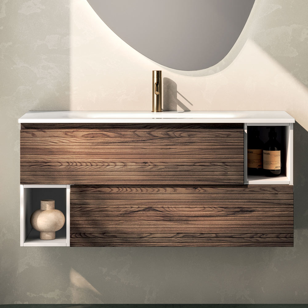 En elegant, upphängd badrumskomposition som kombinerar träets värme med rena, moderna linjer, designad för raffinerade utrymmen med en stark personlighet.