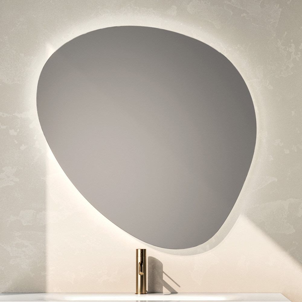 Den formade LED-spegeln blir ett verkligt inredningselement: dess mjuka form och integrerade belysning skapar ett raffinerat ljusspel som förstärker rumsuppfattningen och ger djup åt badrummet.