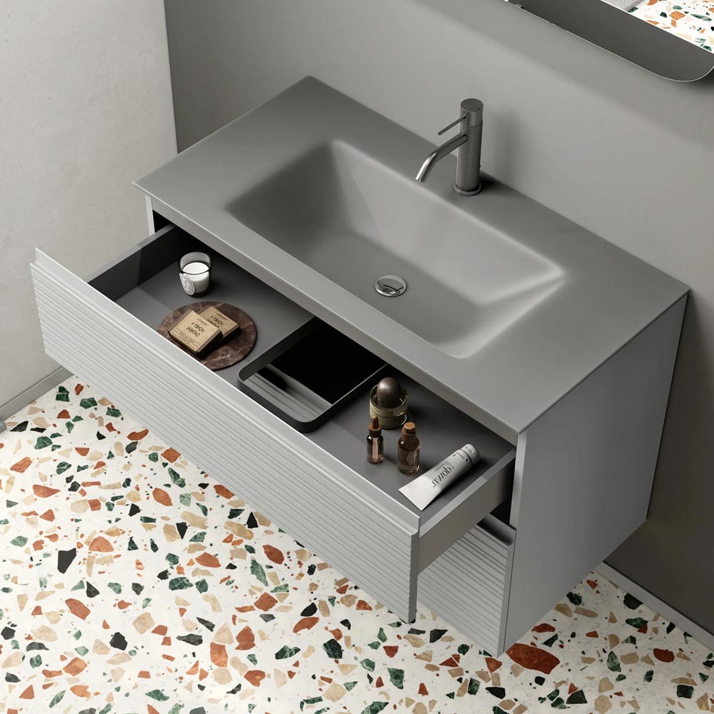Det väggmonterade badrumsskåpet med lådor , tillverkat i en sofistikerad mattgrå finish , kombinerar minimalistisk estetik och funktionalitet och erbjuder praktiskt och välorganiserat förvaringsutrymme. De texturerade ytorna ger visuellt djup och diskret elegans till utrymmet.