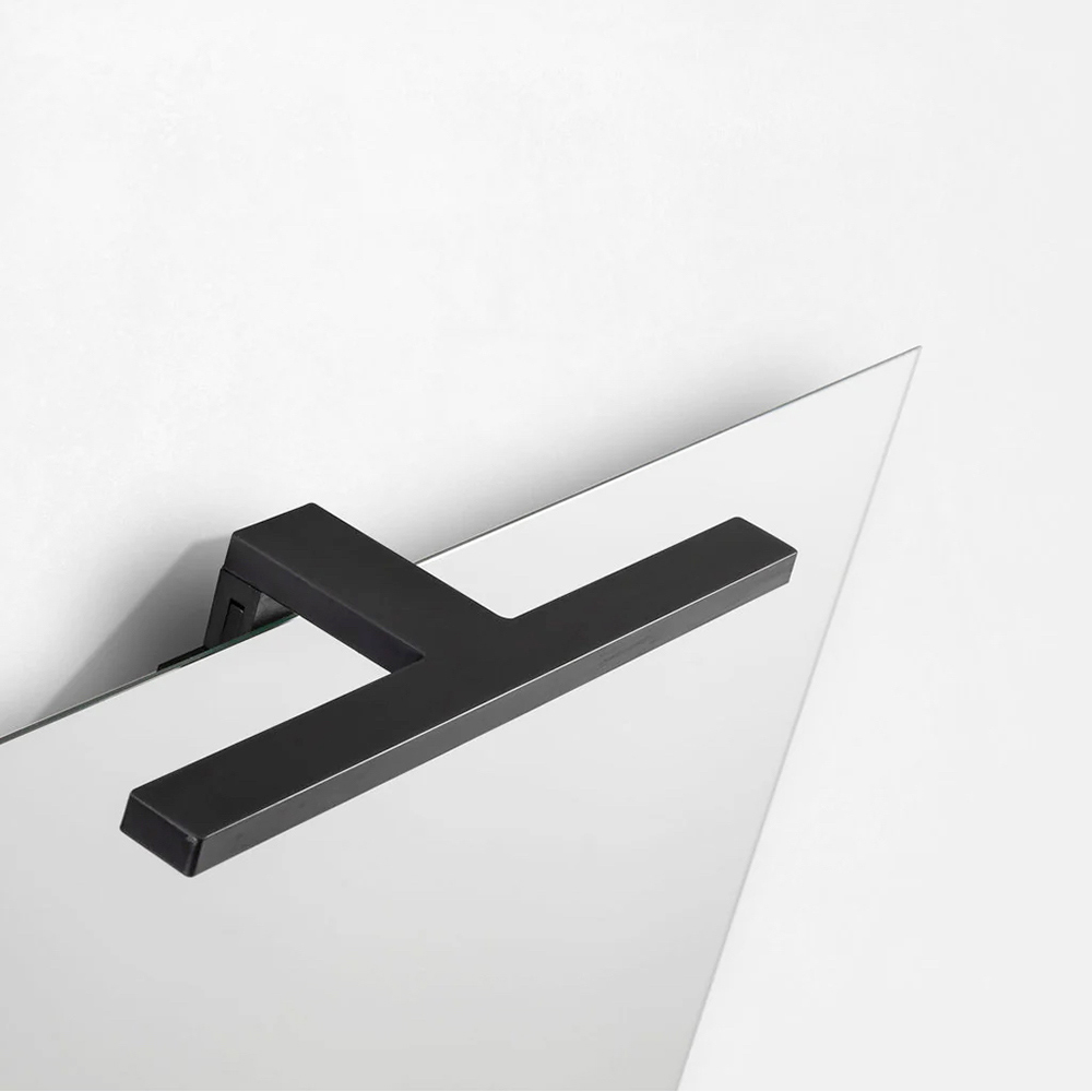 Den formade spegeln tillför ett distinkt dekorativt element, vilket visuellt utökar utrymmet och förstärker väggens raffinerade och moderna utseende.