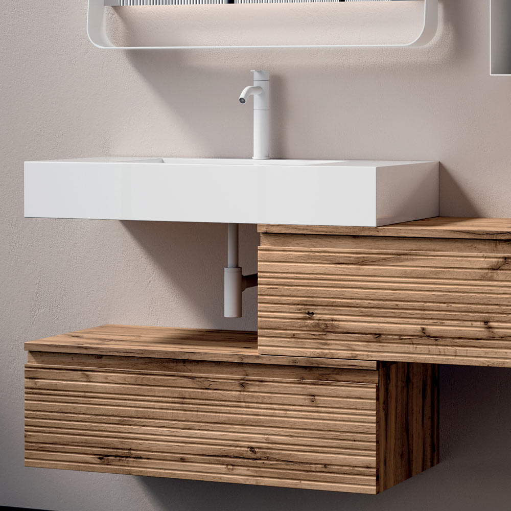 Elegant, upphängd badrumskomposition som kombinerar värmen hos naturligt trä med moderna linjer, perfekt för moderna och raffinerade badrum.
