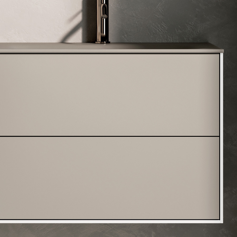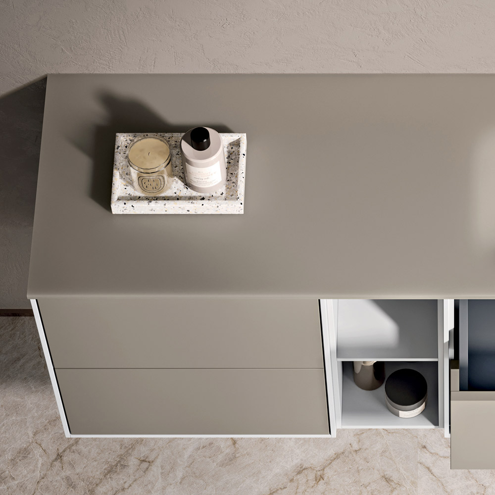 Kompositionen kännetecknas av två upphängda socklar med två rymliga lådor vardera , perfekta för att bättre organisera tillbehör och badrumsprodukter, vilket bibehåller en ren och prydlig estetik.