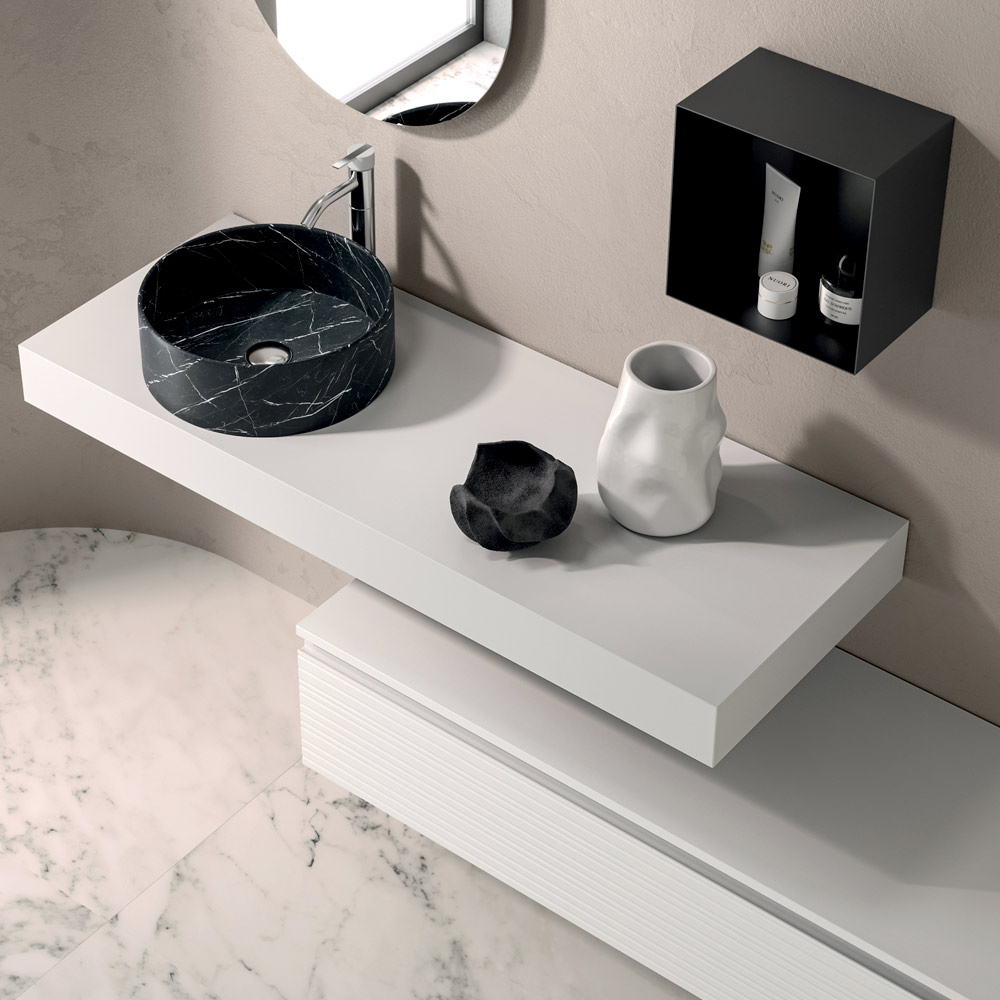 Keramikhandfatet med Marquina-effekt , med mjuka linjer och en stark materialpåverkan, introducerar en elegant kromatisk kontrast som förskönar helheten och understryker dess sofistikerade karaktär.