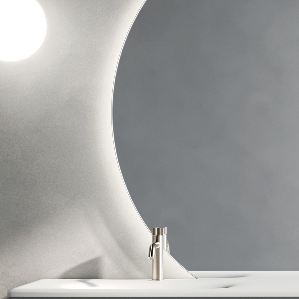 Den cirkulära LED-spegeln kompletterar utseendet. Den sprider ett mjukt, jämnt ljus, vilket förstärker funktionaliteten i diskhon och bidrar till att skapa en välkomnande och avkopplande atmosfär.