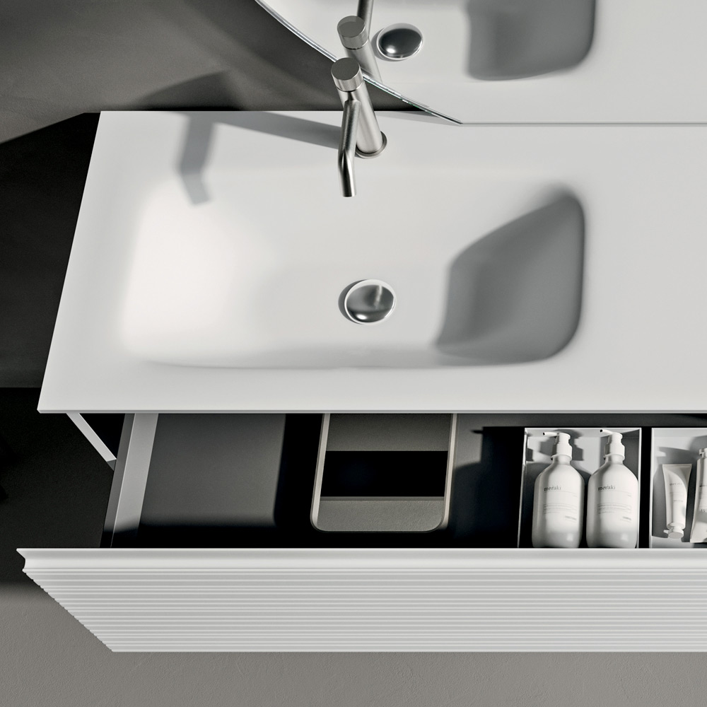 Det rektangulära handfatet , med sina rena, moderna former, integreras perfekt i skåpets design och skapar en elegant och praktisk handfatyta, lämplig för vardagsbruk.