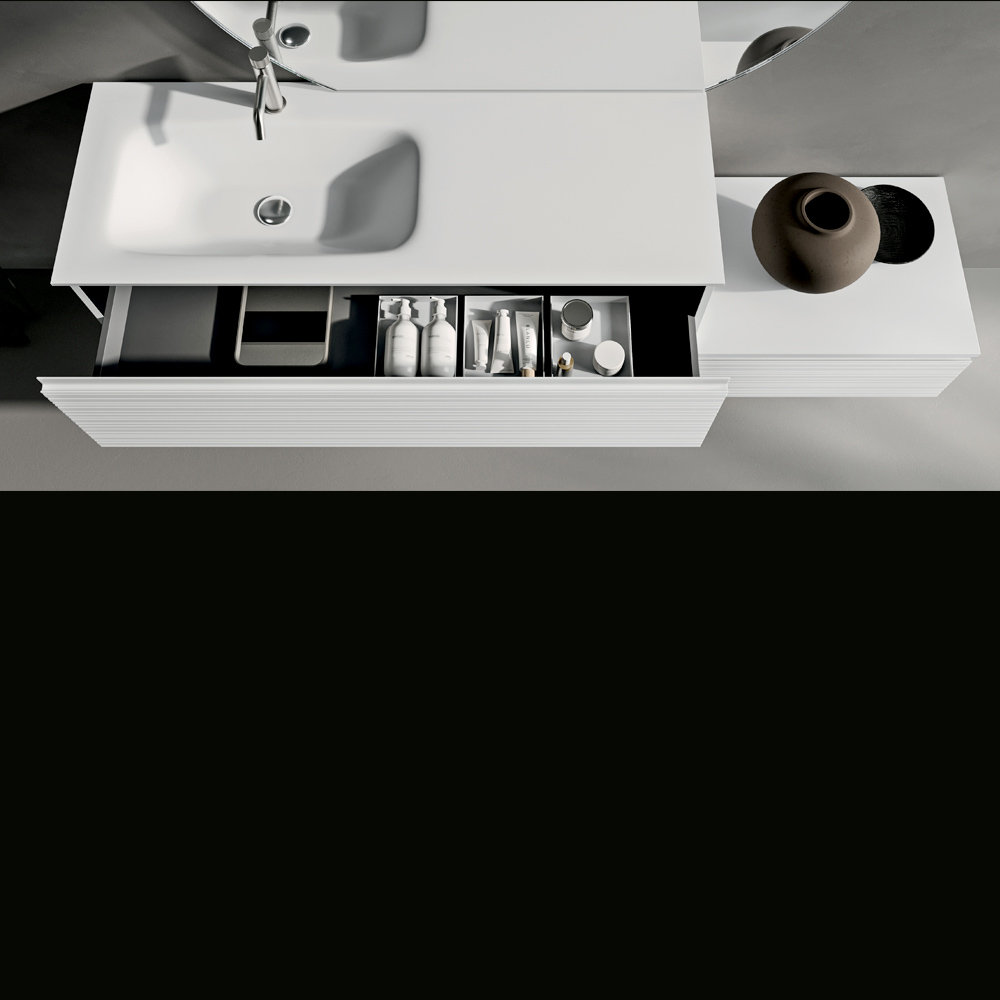 Det matta vita badrumsskåpet har rena linjer och balanserade proportioner, vilket erbjuder en funktionell och diskret förvaringslösning. Den matta finishen förstärker färgens renhet, vilket gör kompositionen idealisk för både bostadsutrymmen och exklusiva entreprenadprojekt.