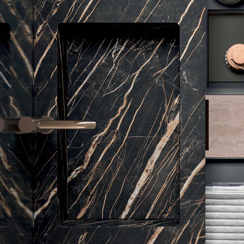 Bänktvättstället i stengods med en mörk steneffekt ger en stark materialidentitet och garanterar hög prestanda vad gäller motståndskraft och hållbarhet, vilket gör det perfekt för vardagsbruk.
