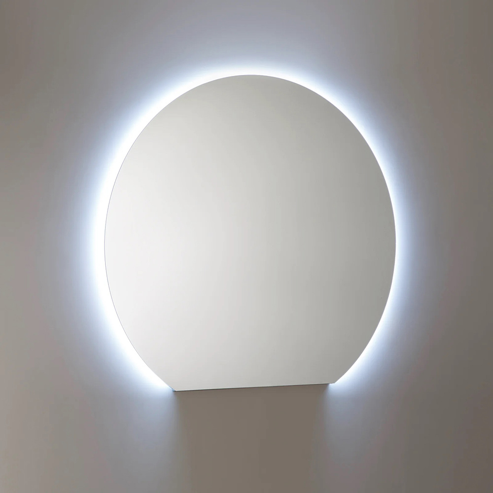Den runda spegeln med integrerad LED-belysning kompletterar kompositionen och ger utrymmet djup och förbättrar användningen av diskbänksområdet, vilket skapar en välkomnande och sofistikerad atmosfär.