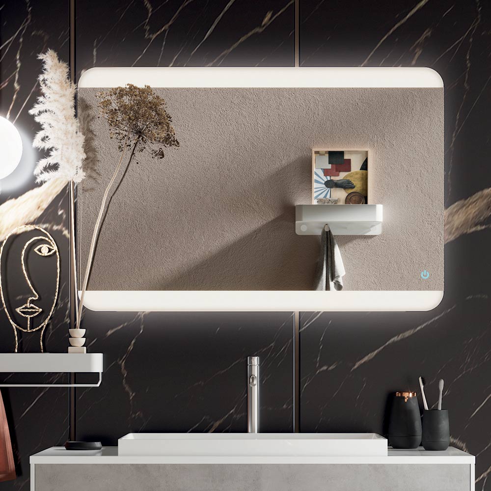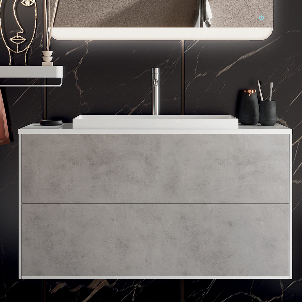 Badrumskomposition komplett med inbyggt tvättställ i harts, glasspegel med front- och omkrets-LED och cementfärgad reptålig melaminbas med 2 helt utdragbara lådor och mjuk stängning.