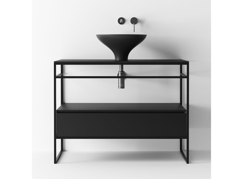 Badrumskomposition helt tillverkad i Italien bestående av handfat, bas och spegel. Tvättstället är tillverkat i keramik med en mattsvart finish med sina harmoniska kurvor i dialog mellan estetik och elegans och är designad för moderna och sofistikerade miljöer. Sockeln har en mattsvart rostfri struktur med keramisk topp och trälåda med 45° skärning och långsam stängning. Kompositionen kompletteras av den ovala bakgrundsbelysta väggspegeln med mattsvart aluminiumram .